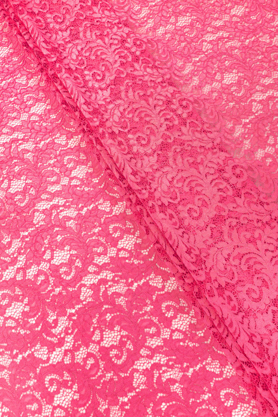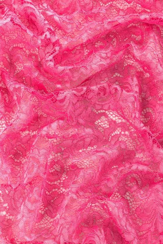Italská krajka v sytě růžové - růžové. Látka má hustý květinový motiv spojený síťovinou a zakončený šňůrkou. Korunka je zakončena ozdobným zubem na obou stranách - šijeme ji po obvodu. Velmi pěkná nabídka pro lidi, kteří mají rádi výrazné letní barvy.