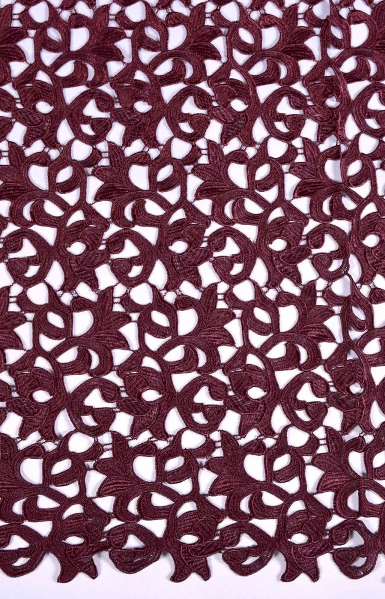Italská látka guipure ve vínové barvě v kupónech o rozměrech 70 cm* 120 cm a 90 cm* 120 cm. Krásný, hustý květinový vzor s mírně lesklým povrchem, látka je z obou stran zakončena malým ozdobným zubem. Látka je ideální pro lidi, kteří mají rádi elegantní, tmavé barvy. Je ideální pro šití elegantních šatů, halenky, sukně nebo jako dotvoření jiných látek.