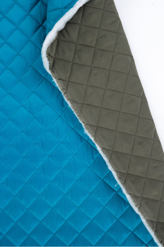 Italská bunda s motivem prošívání (5cm) - oboustranná, na jedné straně v modrozelené a na druhé v khaki. Látka je vyplněna polyesterovou izolací. Ideální pro ušití bundy, kabátu nebo vesty.