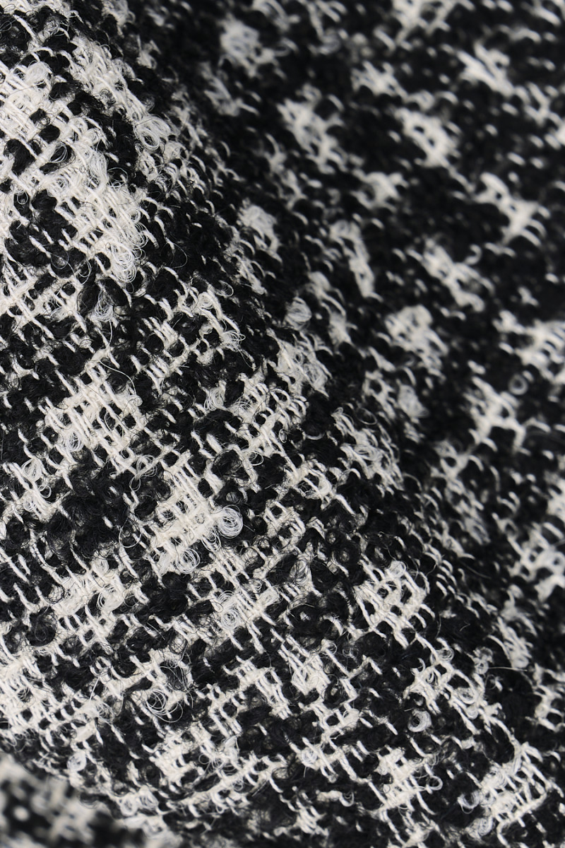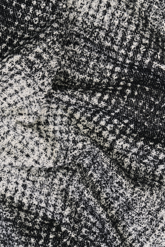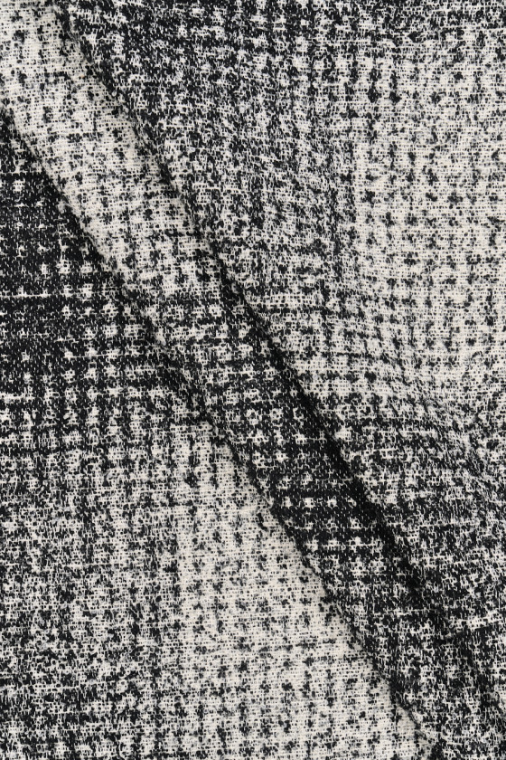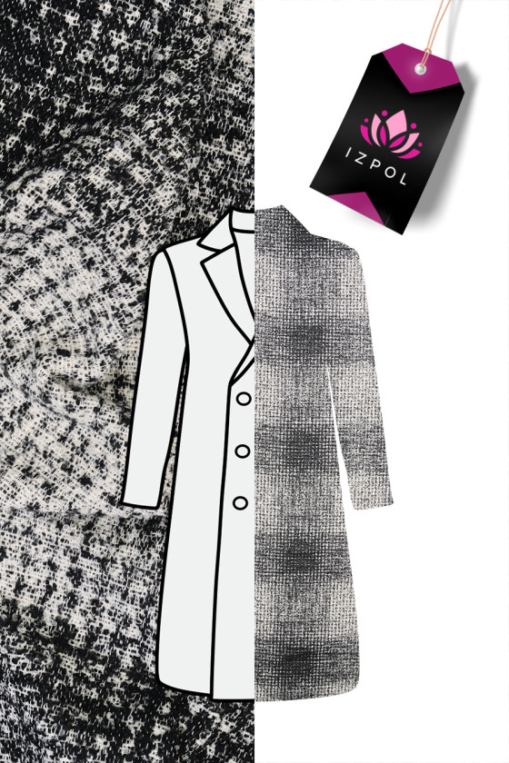 Italská vlněná srst s příměsí viskózy a polyamidu v černé a krémové barvě. Velmi masitá, ušlechtilá tkanina s vypouklou vazbou připomínající boucle. Zajímavá vazba dvou barev nití vytváří velký kostkovaný motiv. Skvěle se hodí k šití podzimně-zimního kabátu, bundy nebo teplé vesty. Kombinace přírodních vláken se syntetickými vlákny má za následek, že tkanina je hřejivá, ale zároveň pevná a odolná. Krásná a velmi originální látka pro lidi, kteří mají rádi neobvyklé materiály za dobrou cenu.