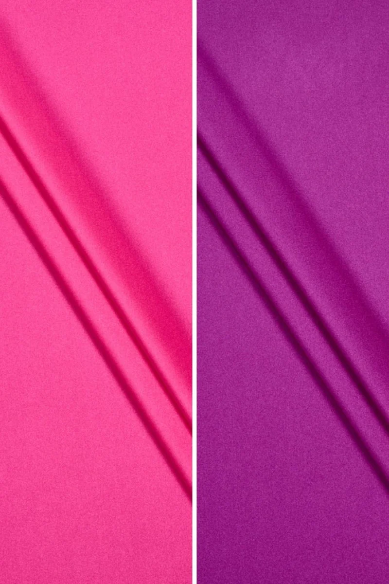 Elastická pletenina z lycry ve dvou barvách: růžové a fialové. Pletenina s kompaktní, těsnou vazbou, velmi elastická - ideální pro lidi, kteří mají rádi oblečení obepínající tělo. Je ideální pro šití tanečních nebo večerních šatů i plavek, protože je pohodlný, rychleschnoucí a má příjemný lesk.