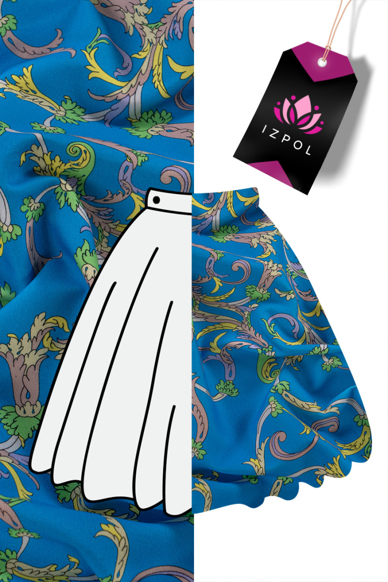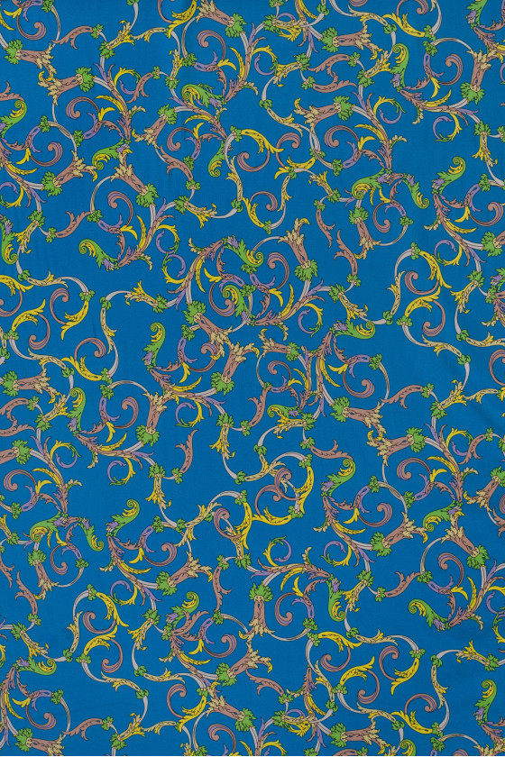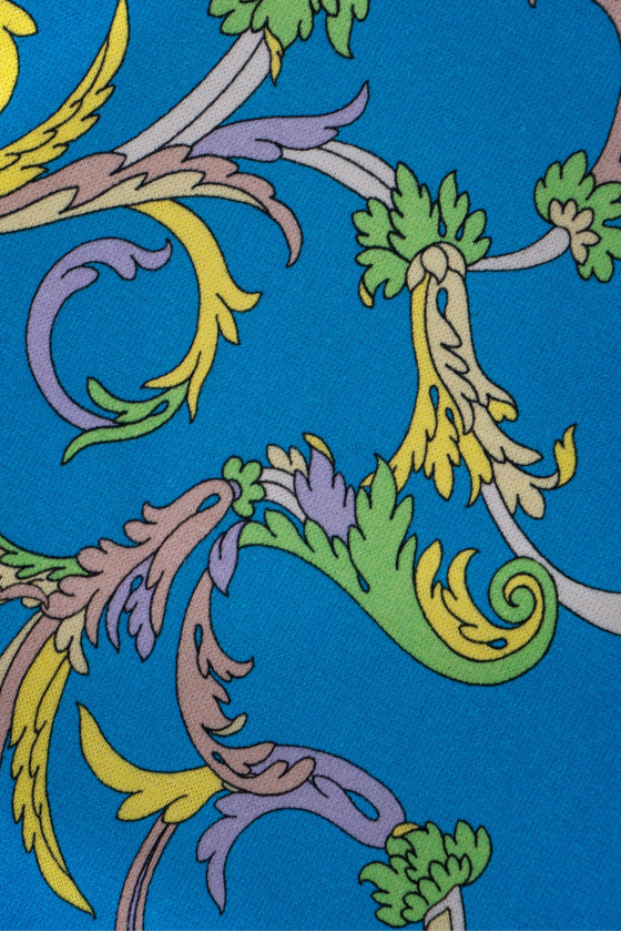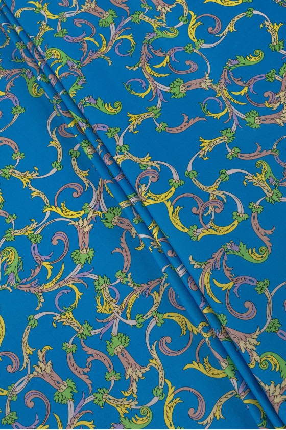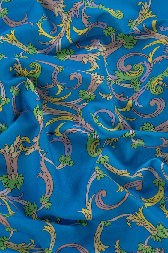 Italský viskózový žerzej v modré barvě s motivem zelených a žlutých orientálních motivů. Žerzejová tkanina je krycí, měkce splývající pletenina, kterou lze šít bez podšívky.