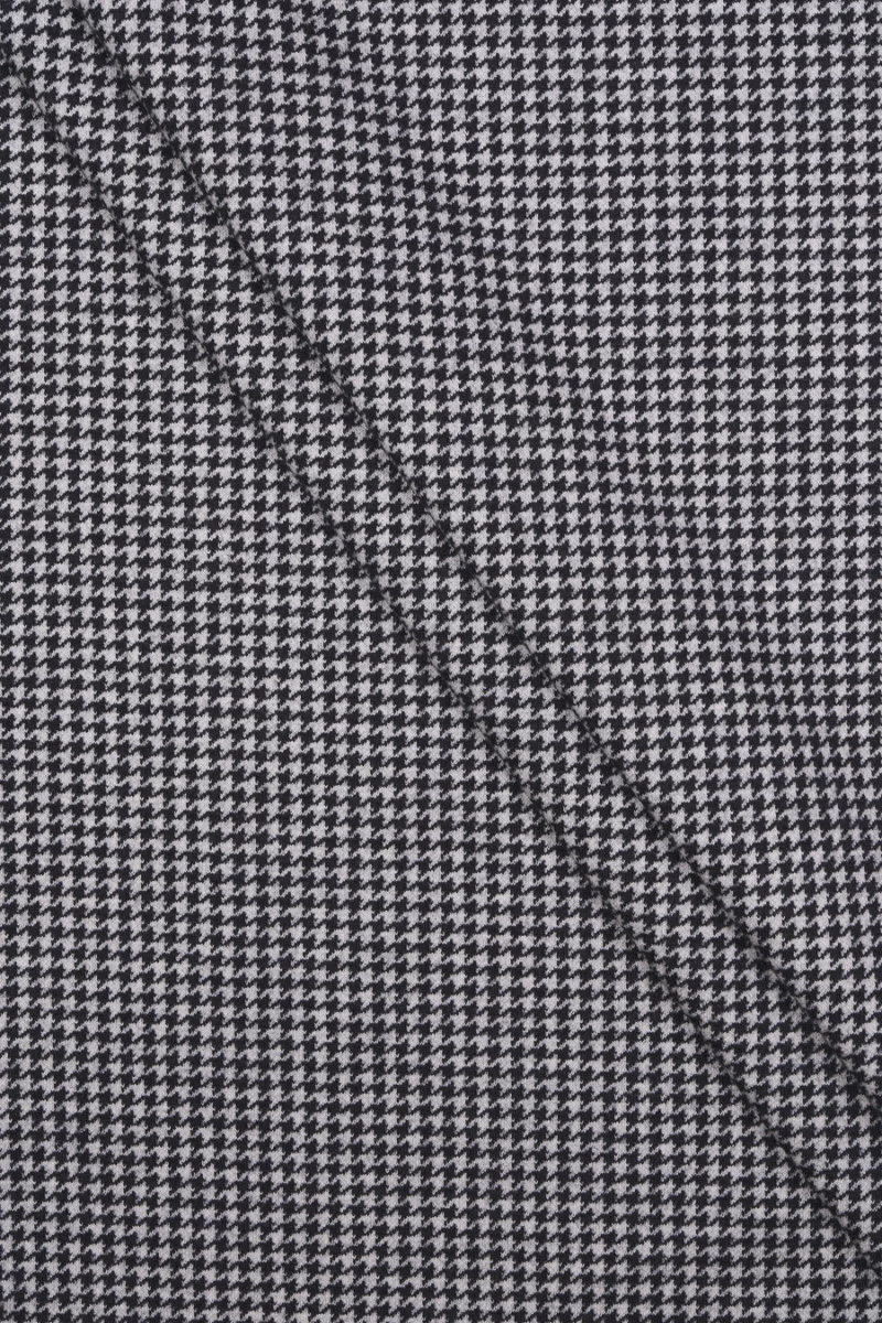Italský žerzejový úplet 100% vlna s černo-šedým motivem kuřecí nohy (0,5 cm). Žerzejová tkanina je krycí, měkce splývající pletenina, kterou lze šít bez podšívky.