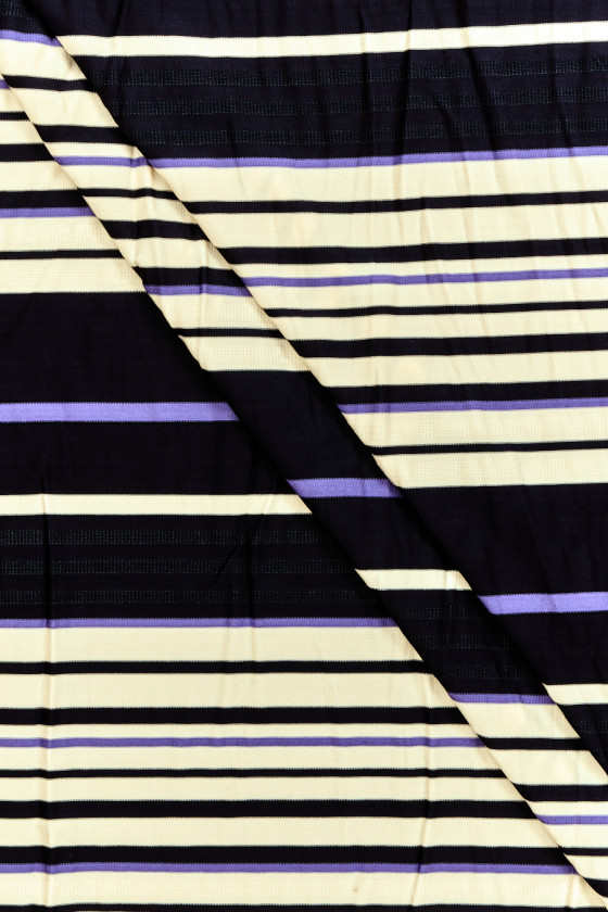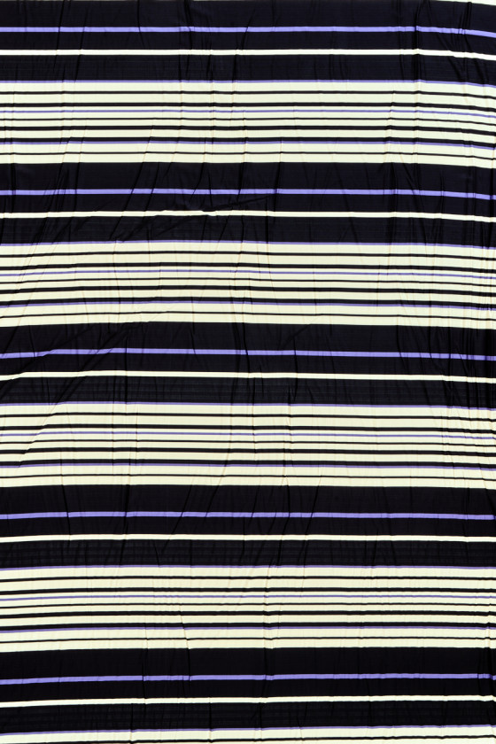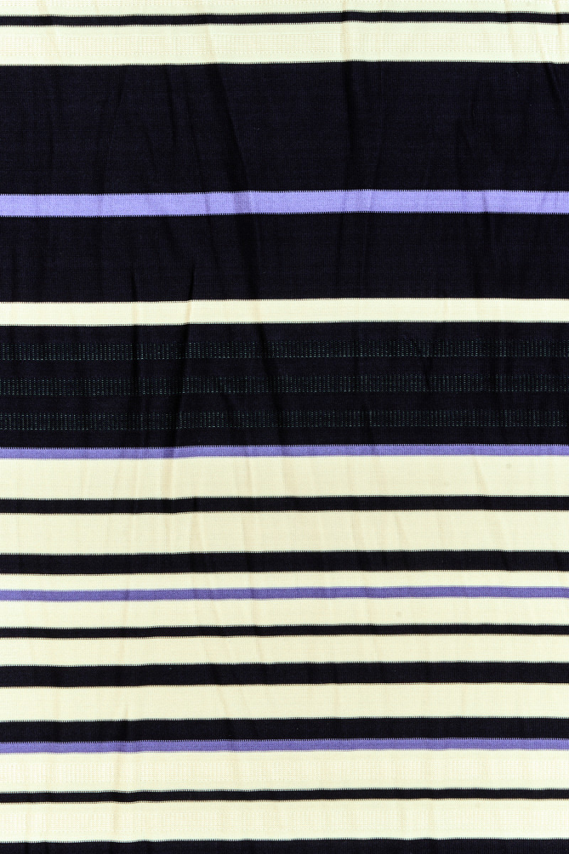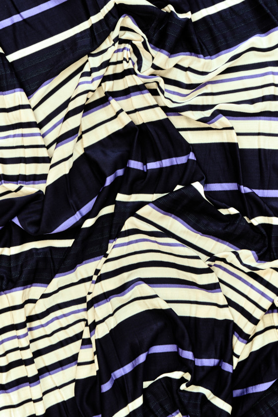 Italská 100% viskózová pletenina s proužky v tmavě modré, fialové a krémové barvě. Hustý vzor se opakuje každých 24 cm. Pletenina je splývavá, lehká, elastická, tenká, ale neprůhledná. Skvěle se hodí na šití halenky, šatů a sukně.