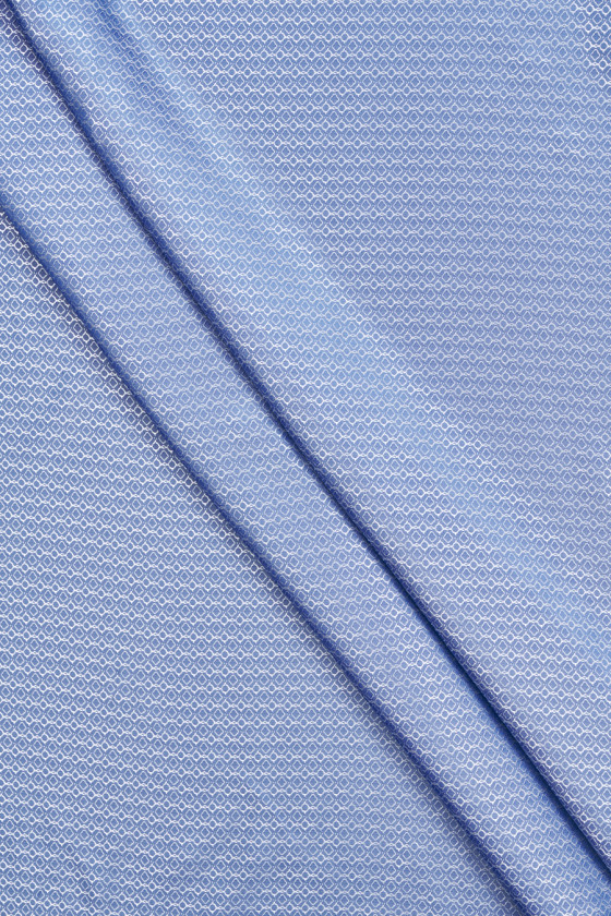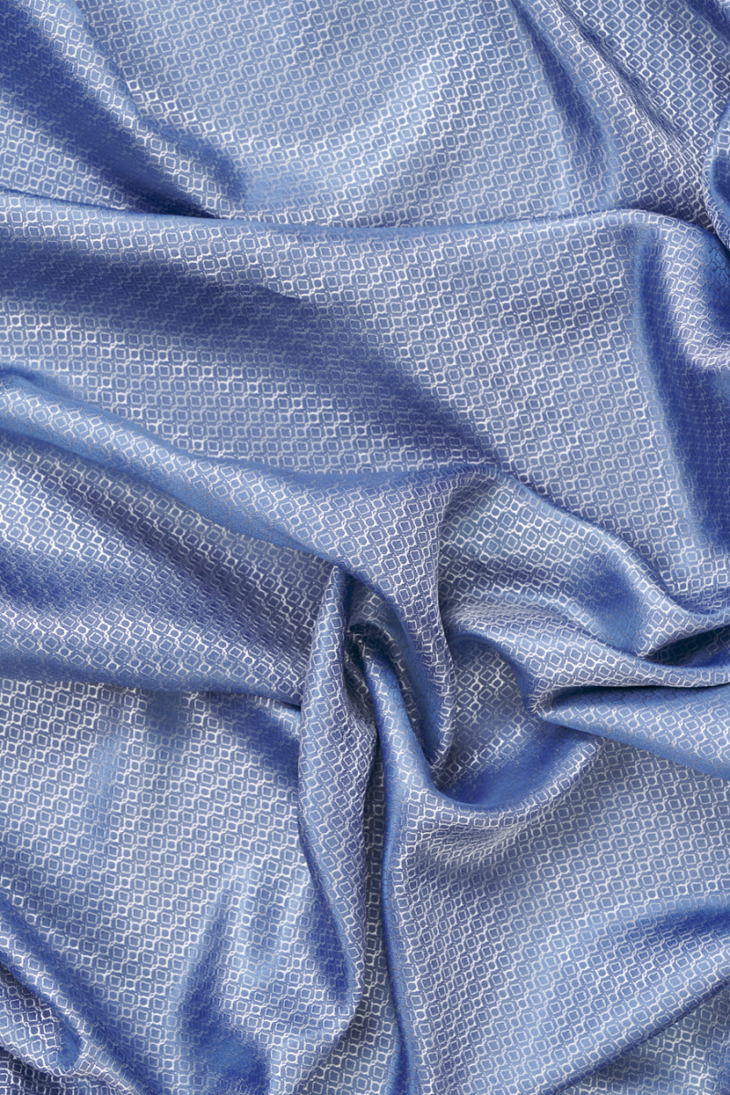 Italská žakárová podšívka ze dvou barev nití, modré a stříbrné, které vytvářejí dvoubarevný efekt. Látka s hustým motivem drobných geometrických vzorů připomínajících diamanty o šířce 0,5 cm. Podšívka je neelastická s velmi ušlechtilým leskem, lze ji šít z obou stran. Díky svému přírodnímu složení se skvěle hodí jako podšívka na bundu nebo kabát. Fantastická nabídka pro lidi, kteří mají rádi zajímavé, originální podšívky.