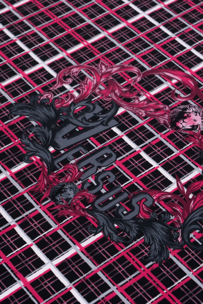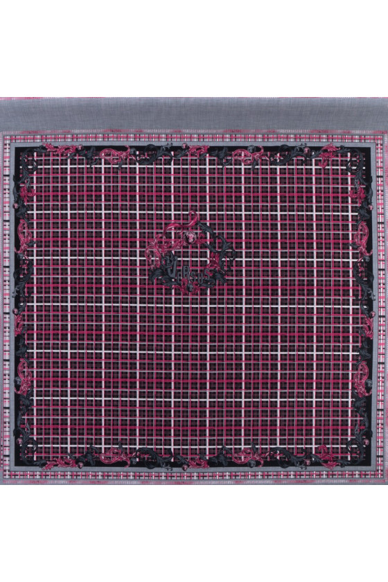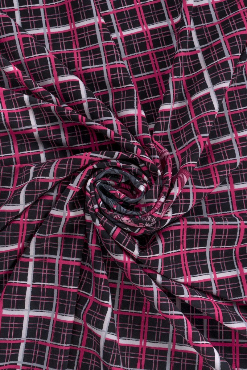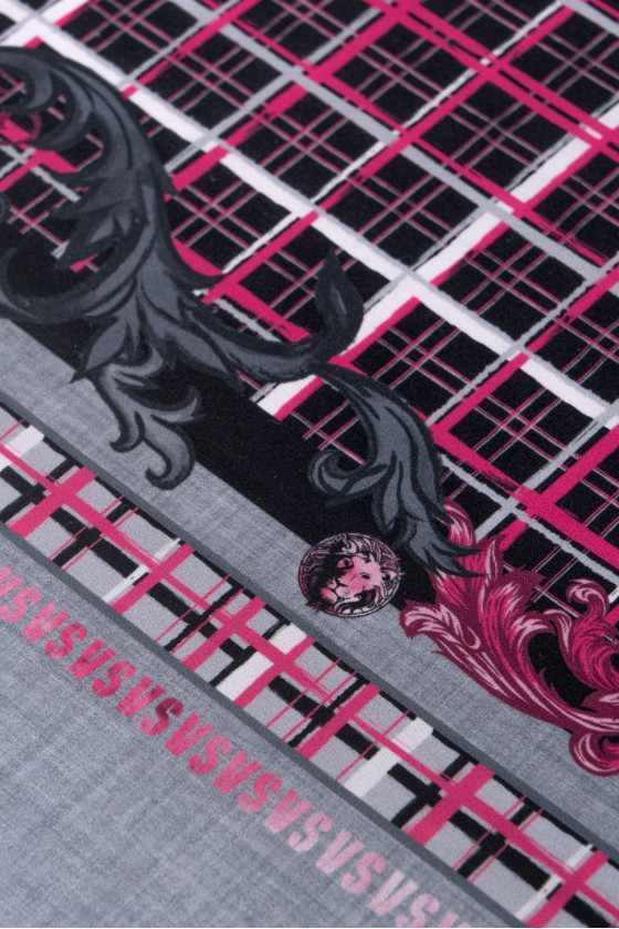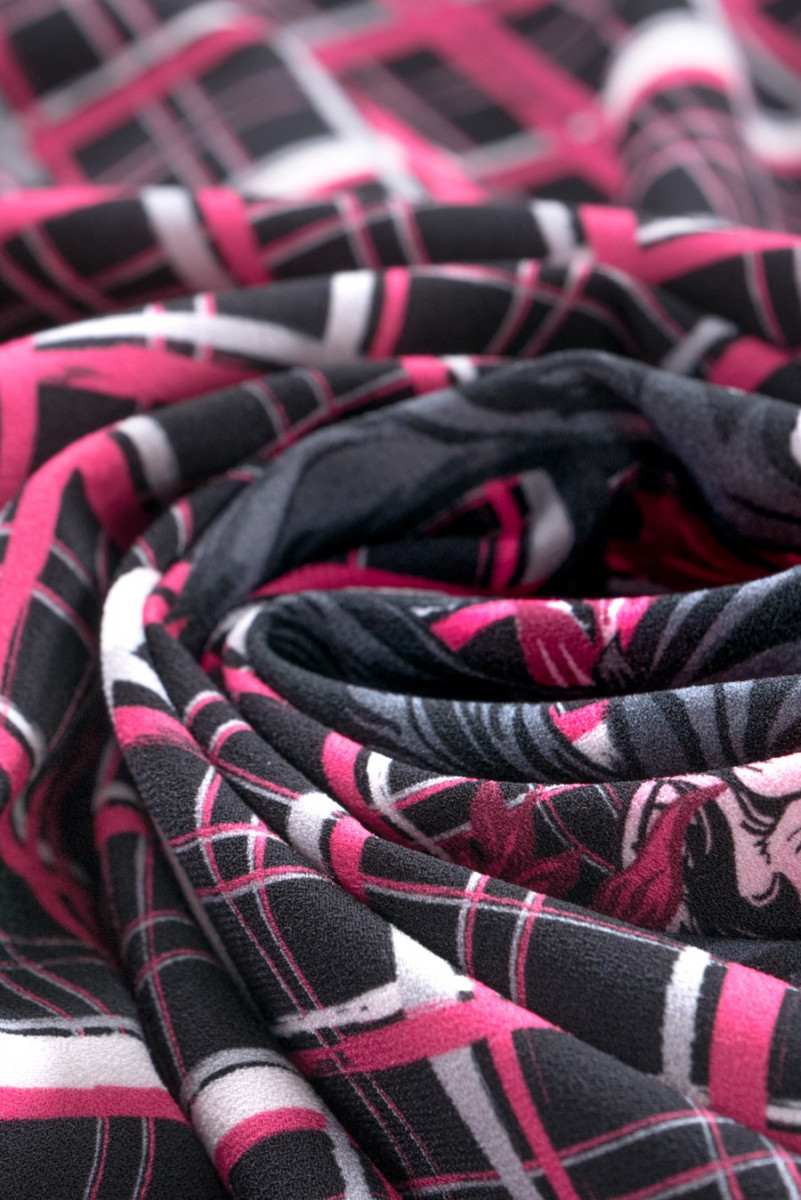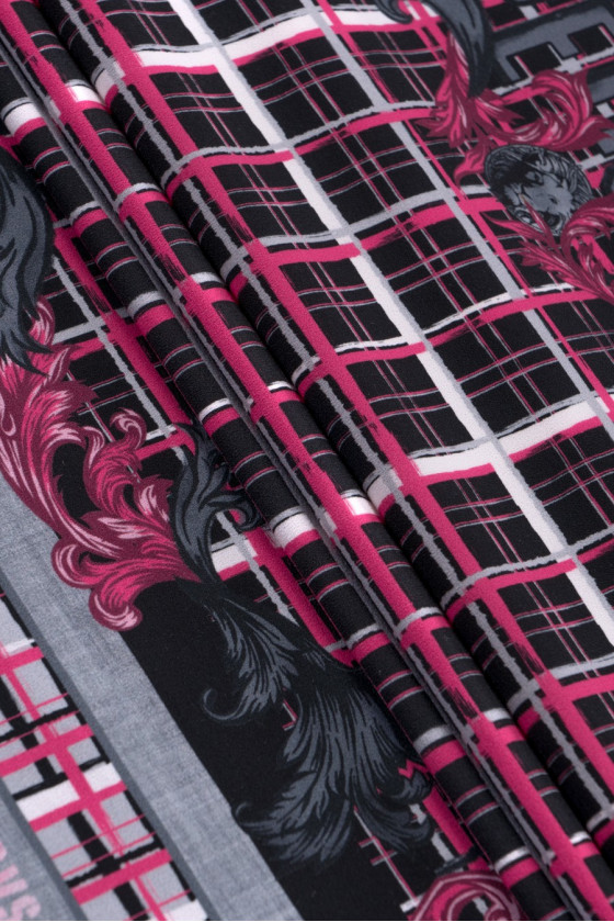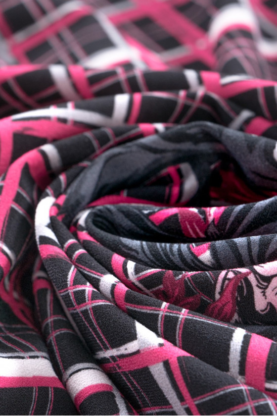 Poslední kupón 135 cm*120 cm od známé módní značky utkaný z polyesteru s elastanem. Látka připomíná vlnu v tloušťce, v růžové a šedočerné barvě s nepravidelným kostkovaným vzorem a charakteristickým firemním nápisem uprostřed kupónu. Doporučeno pro šaty, tuniky