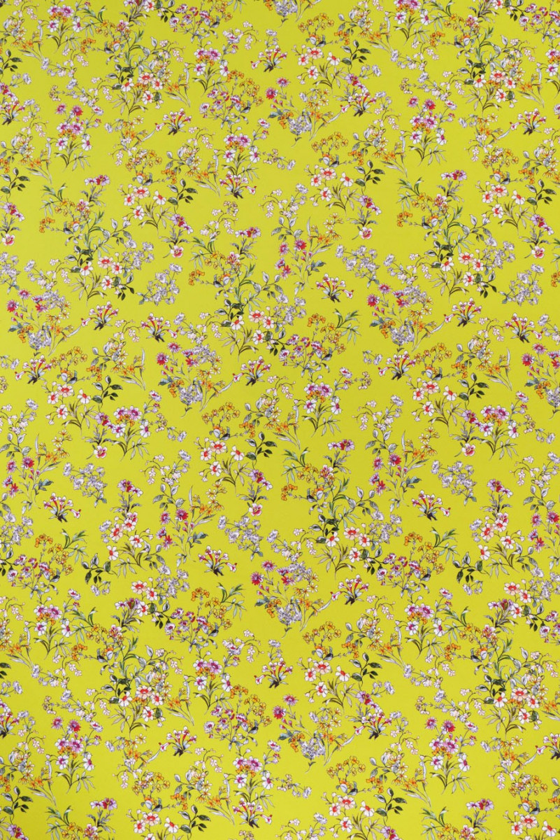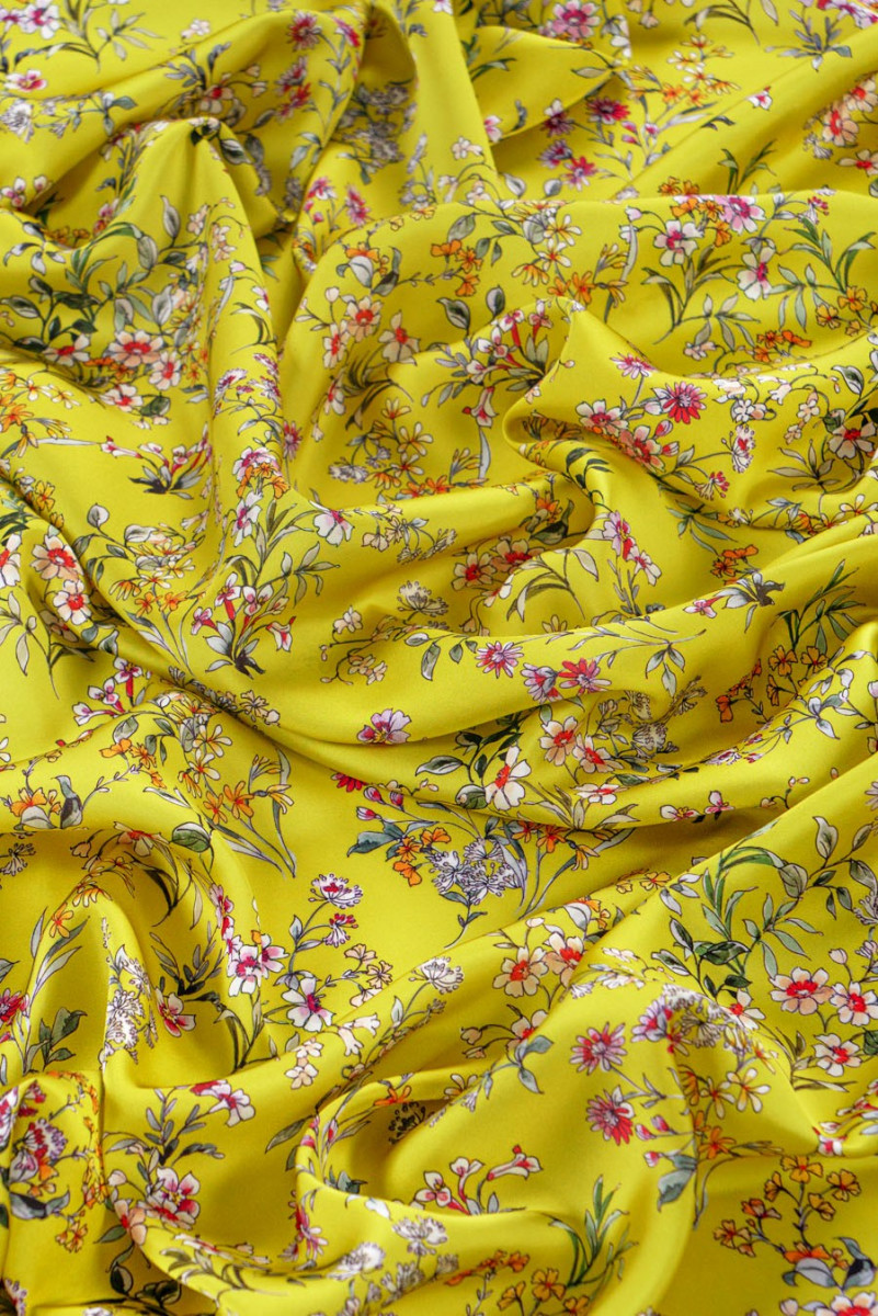 Italský polyesterový satén s malými, zářivými květy na žlutém pozadí. Polyesterový satén je sametová tkanina s jemným leskem.