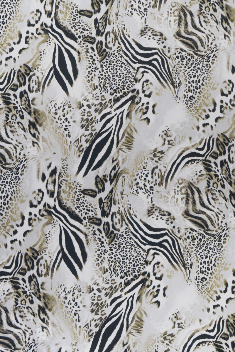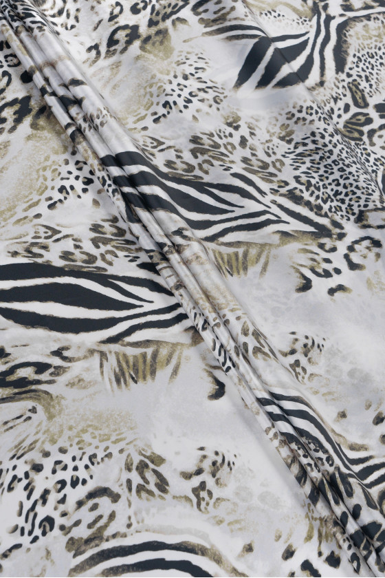 Italský polyesterový satén se zajímavou kombinací různých zvířecích motivů v černé a béžové barvě na světle šedém podkladu.