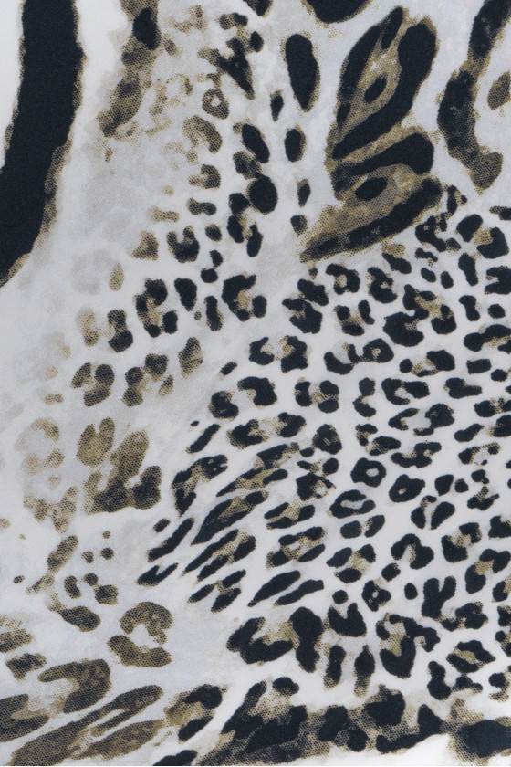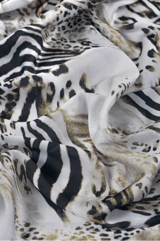 Italský polyesterový satén se zajímavou kombinací různých zvířecích motivů v černé a béžové barvě na světle šedém podkladu. Satén je jemná látka, sametová na dotek, s mírným leskem. Lze s ním vykouzlit vzdušné šaty, jemné halenky, šátky, šátky.