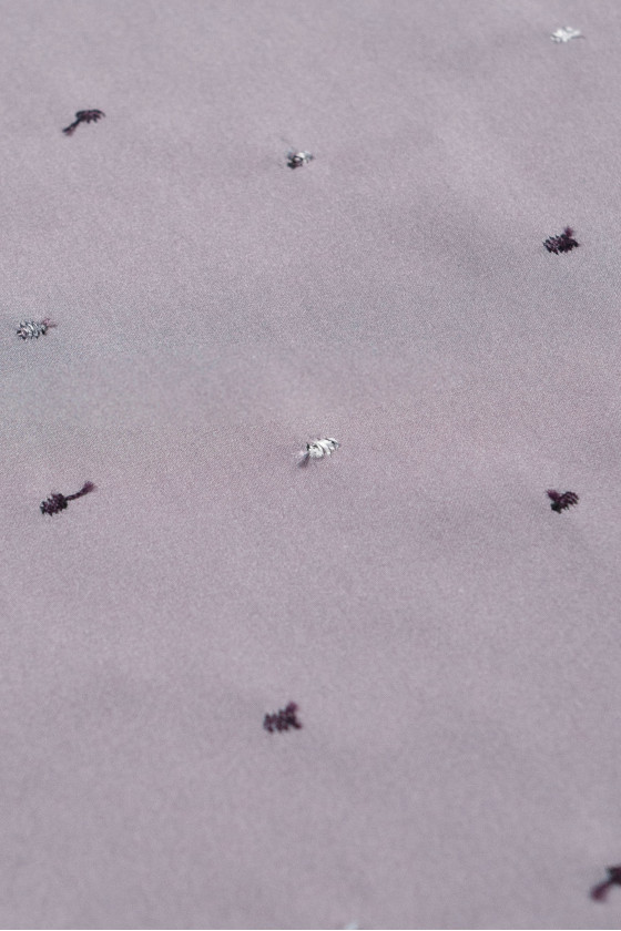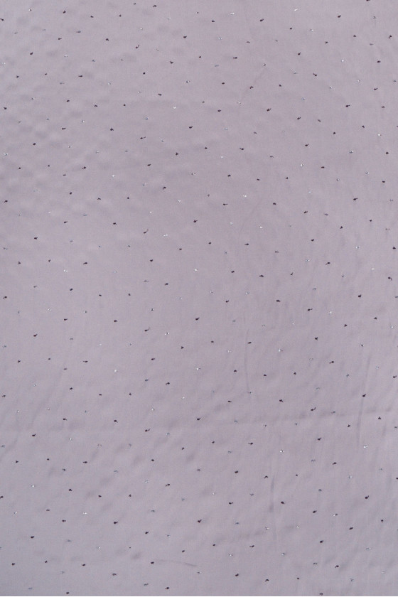 Italský polyesterový satén ve fialové a šedé barvě s vyšívanými malými puntíky. Satén je hustá a lehká tkanina s rovným povrchem, vyrobená v saténové vazbě. Další výhodou je jeho hladkost a odolnost, stejně jako skutečnost, že velmi dobře sedí, neprosvítá a je příjemný na dotek. Na jedné straně je matný a na druhé straně je ušlechtile lesklý. Lze s ním vykouzlit vzdušné šaty, jemné halenky, sukně, šátky, šátky.
