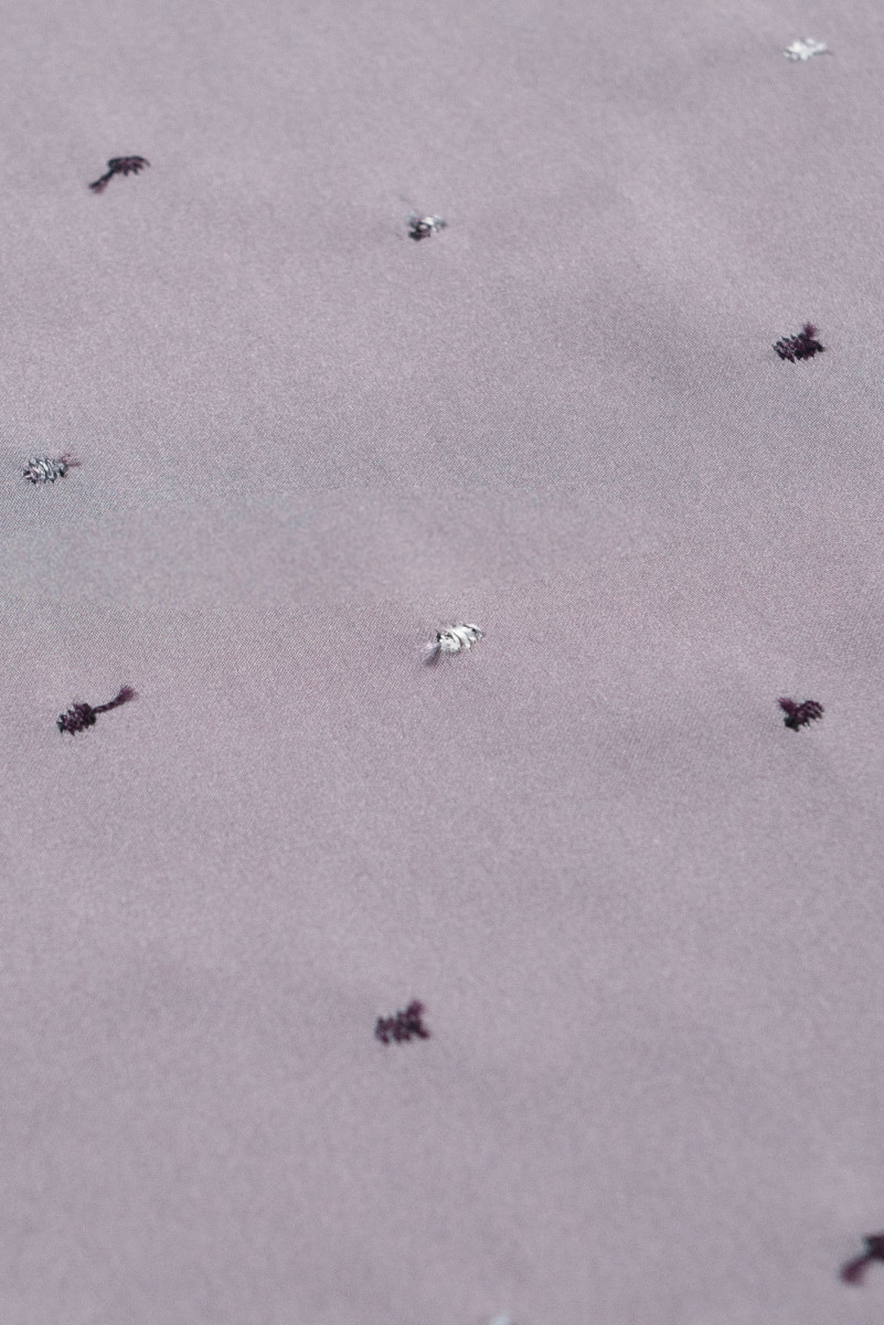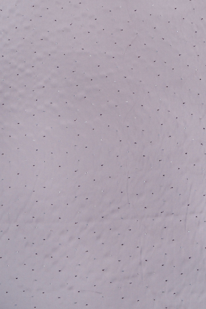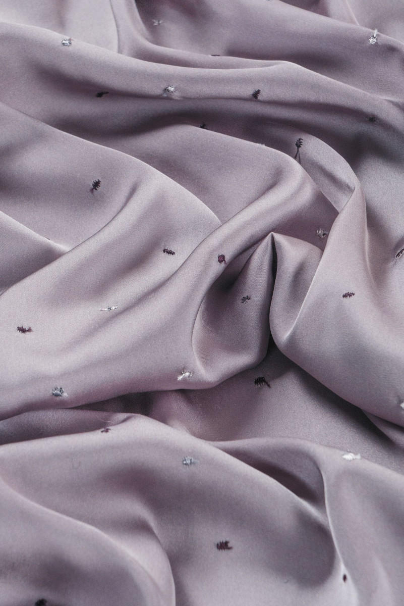 Italský polyesterový satén ve fialové a šedé barvě s vyšívanými malými puntíky.