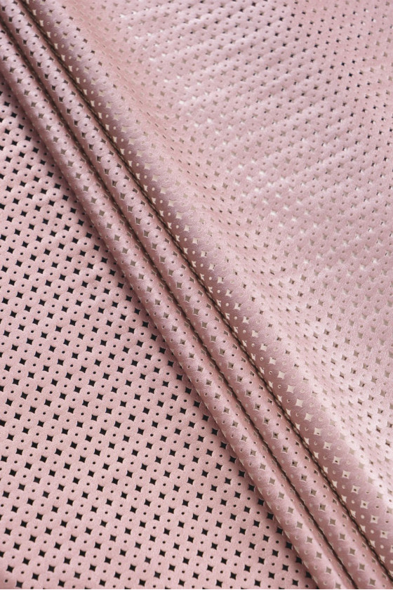 Eko prolamovaná kůže ve světlé, duhově růžové barvě. Struktura se skládá z malých, vzájemně propojených kruhů. Jemná, pružná látka. Doporučujeme pro šití zajímavých tašek, tašek nebo jako dekorační látku.