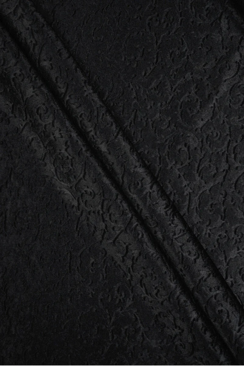 100% bavlněný samet v černé barvě s motivem embosovaných ozdob. Materiál je středně silný, mírně elastický, neprůhledný a má krásný lesk. Leží měkkě a drží tvar hezky. Skvělá volba pro ty, kteří hledají přírodní látky v jedinečném, elegantním vzhledu. Je ideální na šití saka, kostýmu, sukně a kalhot.
