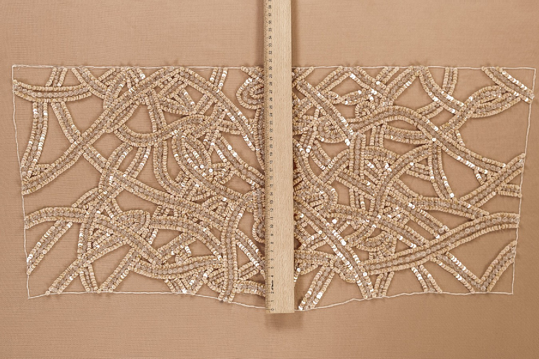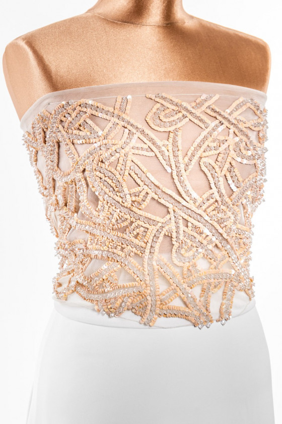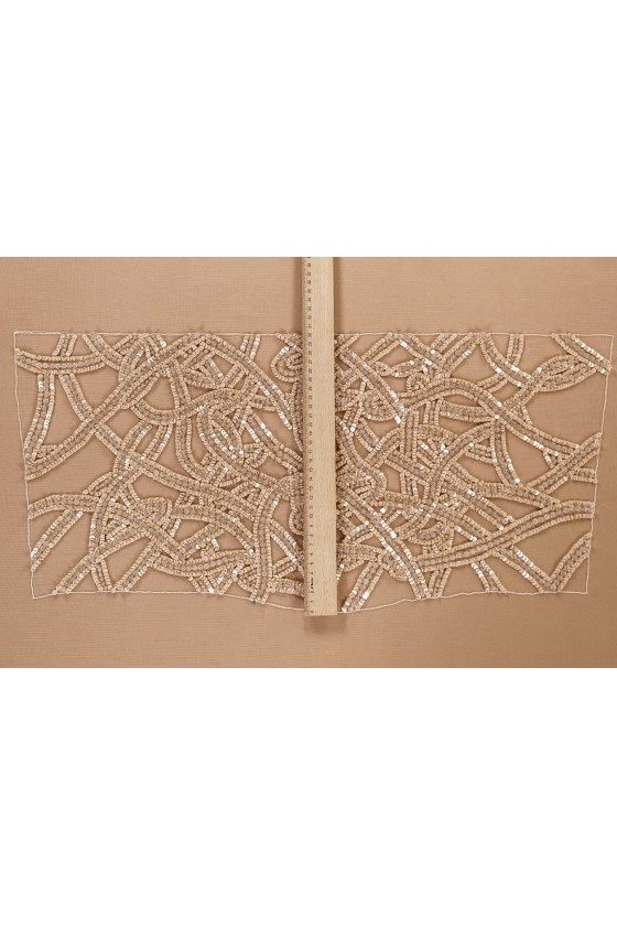 Italská nášivka ve formě korzetu (vpředu). Krásný, efektní vzor vyrobený z meruňkových flitrů a velkých, průhledných korálků. Celek je ušitý na měkké krémově zbarvené tylové síťovině.