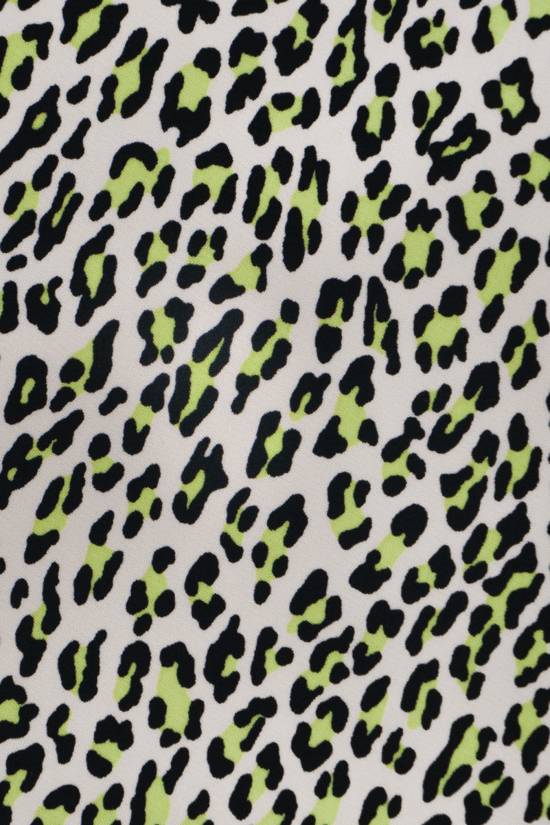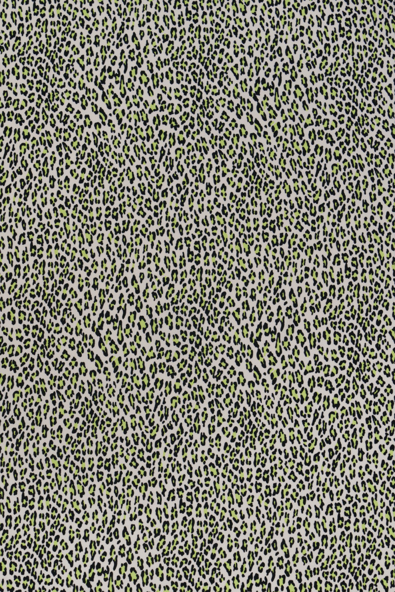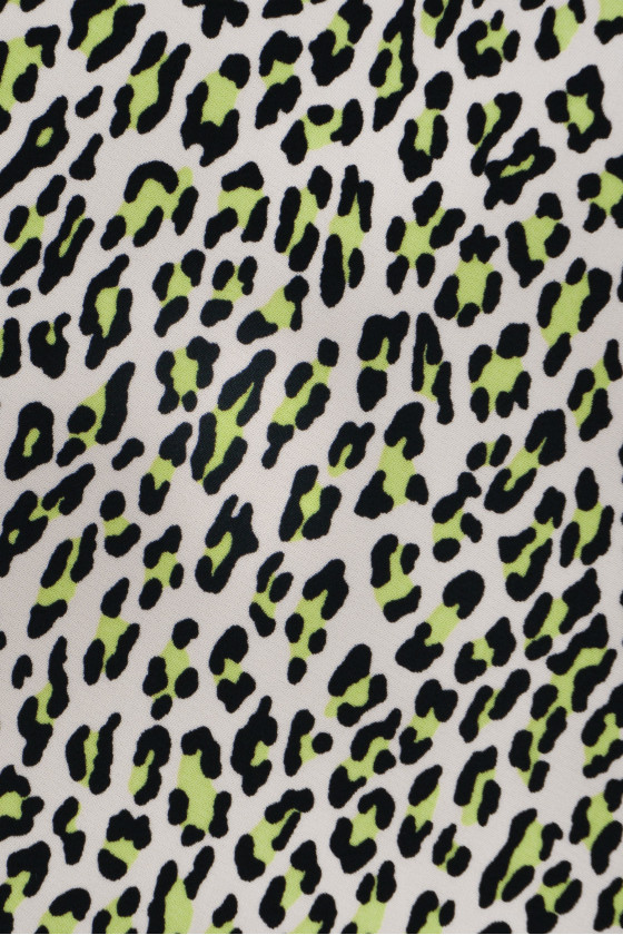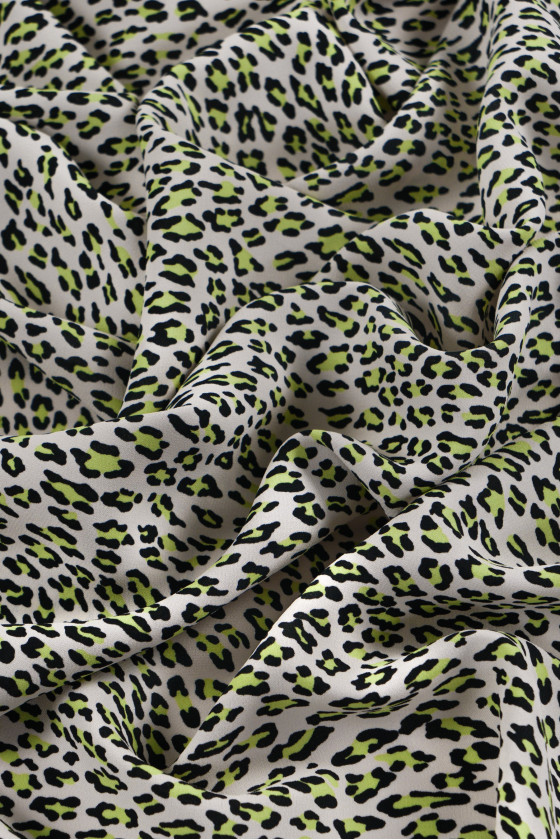 Italská 100% viskózová tkanina s motivem zeleno-černého leopardího potisku na ecru pozadí. Látka je těžká, splývavá, s vazbou připomínající žoržet.