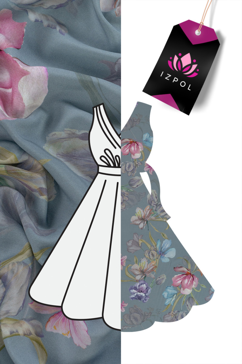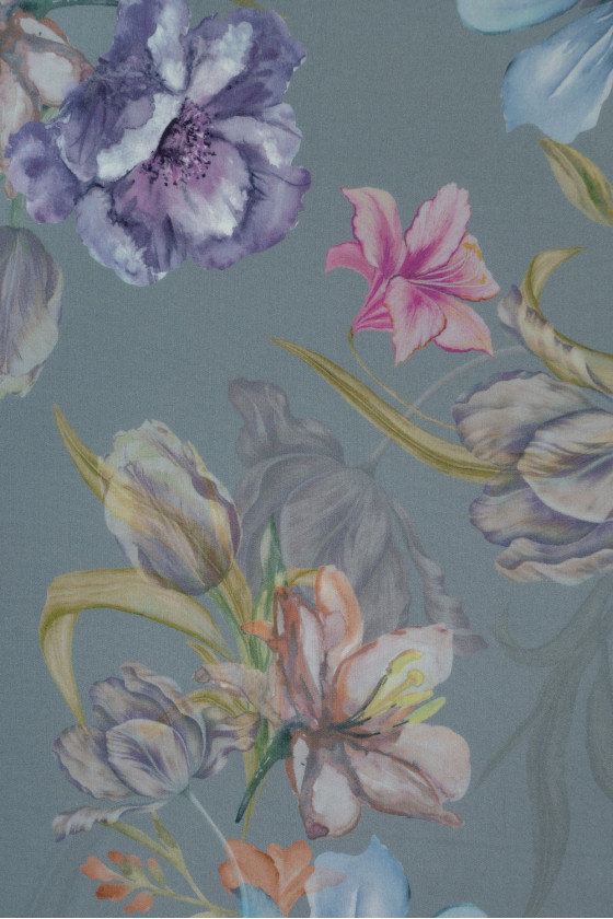 Italská 100% viskózová tkanina v šedomodré barvě s motivem malovaných květin v modré, fialové a růžové barvě. Viskóza je tkanina získaná z celulózy, velmi prodyšná a měkká, je šetrná k pokožce (nealergenní) a dokonale absorbuje vlhkost.
