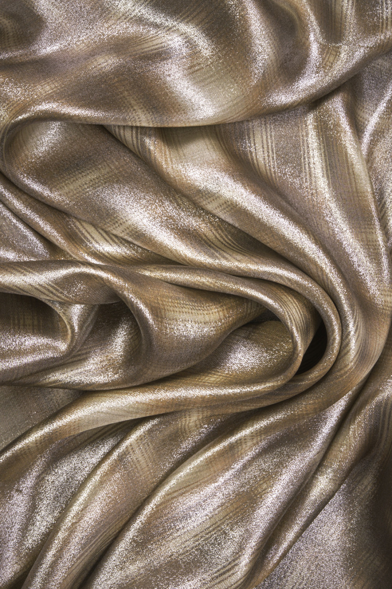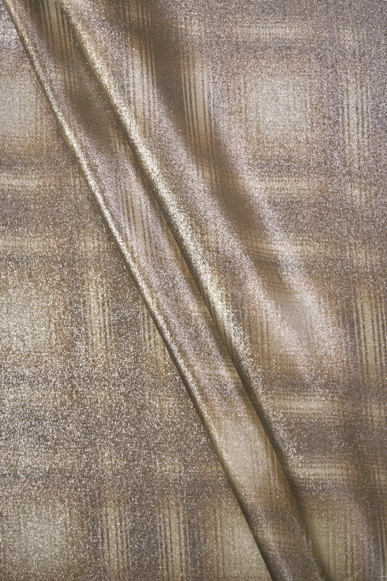 Italská viskózová tkanina s chlupatým károvaným motivem v béžové a hnědé barvě, zdobená zlatou lurexovou nití, která vytváří zářivý efekt. Viskóza je tkanina získaná z celulózy, velmi prodyšná a měkká, je šetrná k pokožce (nealergenní) a dokonale absorbuje vlhkost. Neelastická, mírně průhledná látka - ideální pro šití letních šatů, halenky nebo sukně.