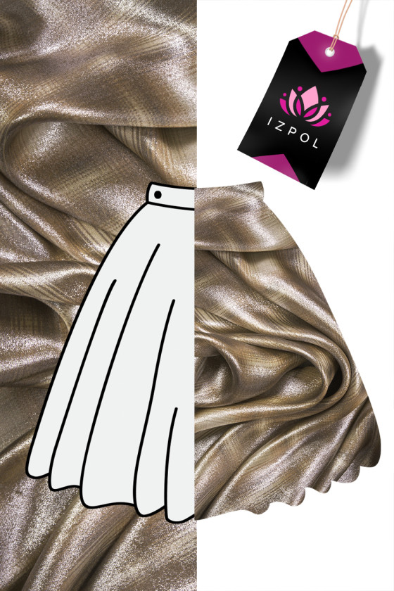Italská viskózová tkanina s chlupatým károvaným motivem v béžové a hnědé barvě, zdobená zlatou lurexovou nití, která vytváří zářivý efekt. Viskóza je tkanina získaná z celulózy, velmi prodyšná a měkká, je šetrná k pokožce (nealergenní) a dokonale absorbuje vlhkost.