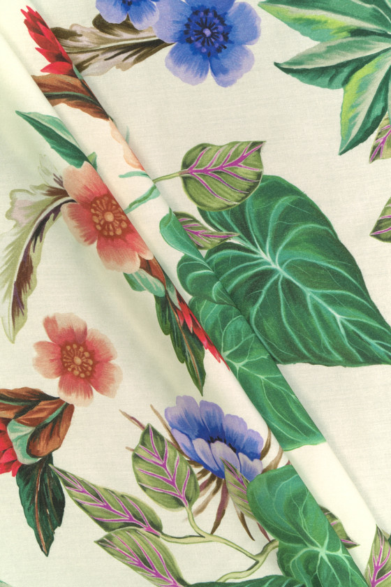 Italská 100% viskózová tkanina ve světle béžové barvě s hustým motivem exotických květin a listů. Potisk byl proveden v zelené a fuchsiové barvě. chrpa, béžová a červená. Látka je měkká a neprůhledná s plátnovou vazbou, velmi příjemná na dotek. Tento druh je ideální pro horké letní dny.