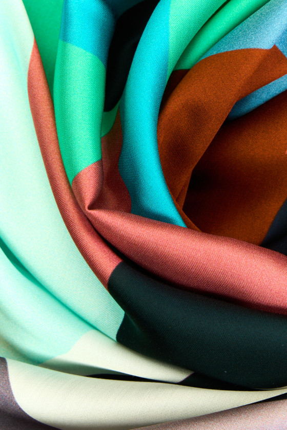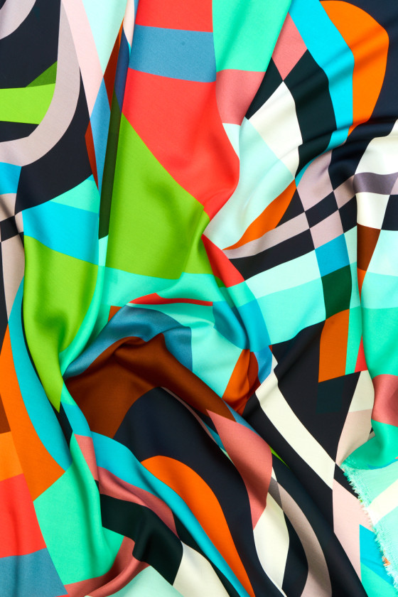 Italská látka 100% viskóza s barevnými geometrickými motivy. Originální vzor v energetických barvách, skládající se z prvků různých velikostí a tvarů. Látka je saténová, měkká, splývavá, lehká a velmi příjemná na dotek. Zajímavá nabídka pro jedinečné outfity, jako jsou šaty, sukně, halenky a košile.
