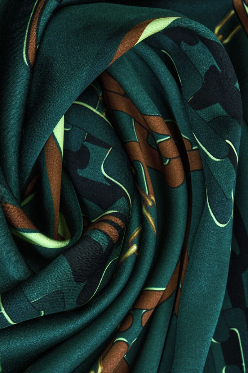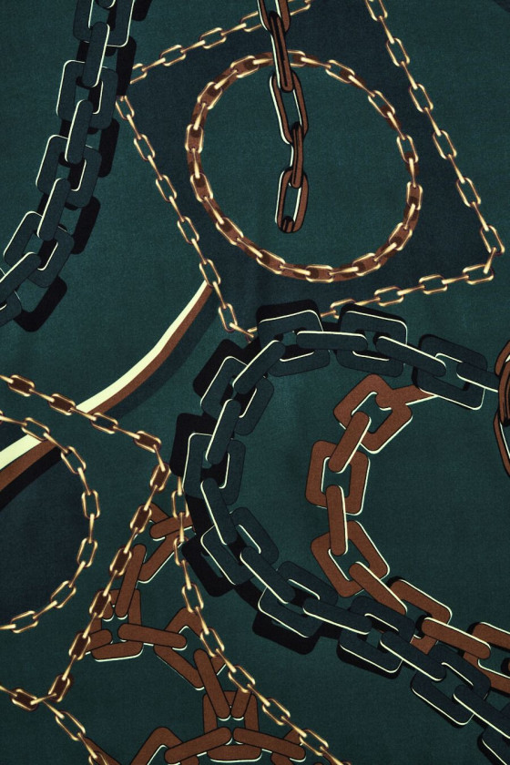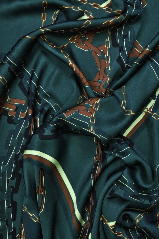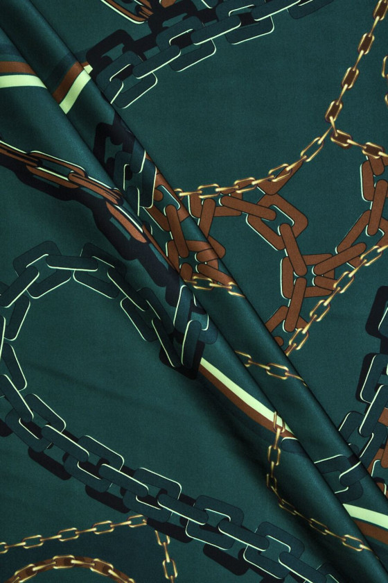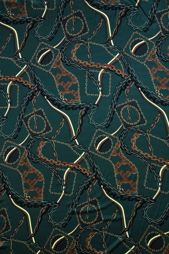 Italská tkanina 100% viskóza s motivem řetízku na lahvově zeleném pozadí. Poměrně hustý vzor vyrobený v módních odstínech hnědé, zelené a černé, řetízky různých velikostí proložené pruhy. Látka je splývavá, příjemná na dotek, tenká, ale neprůhledná, neelastická a zakončená saténovou vazbou. Zajímavá nabídka pro lidi, kteří mají rádi látky s charakterem. Skvěle se hodí pro šití vzdušných šatů, sukní, ale i halenek a košil.