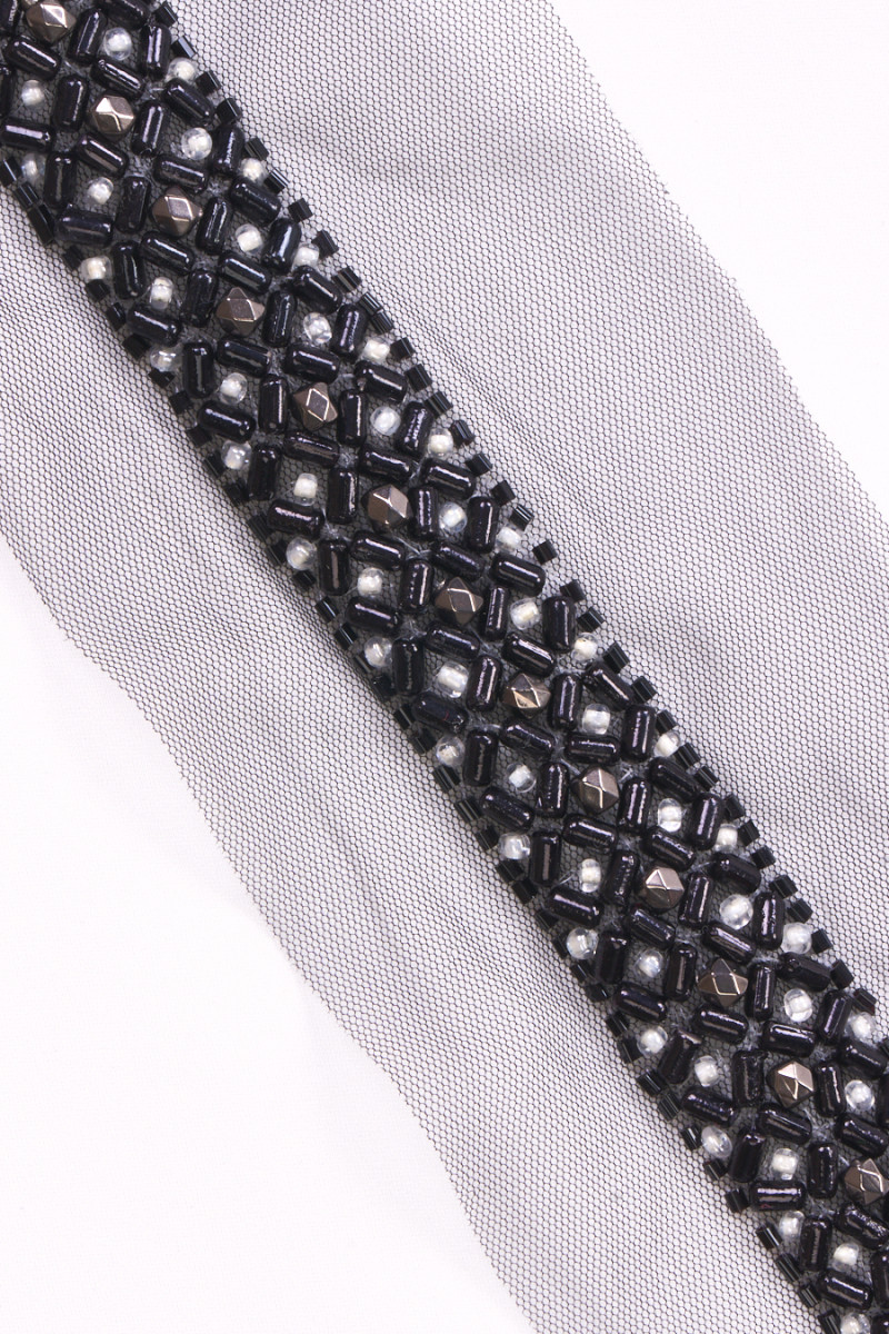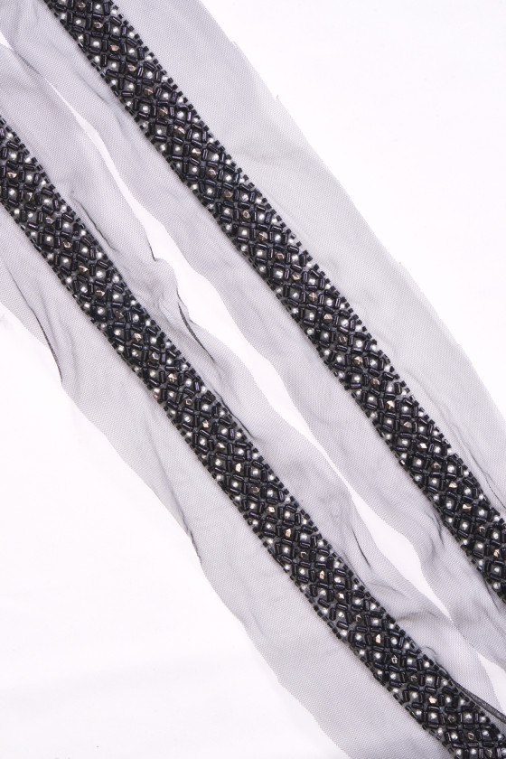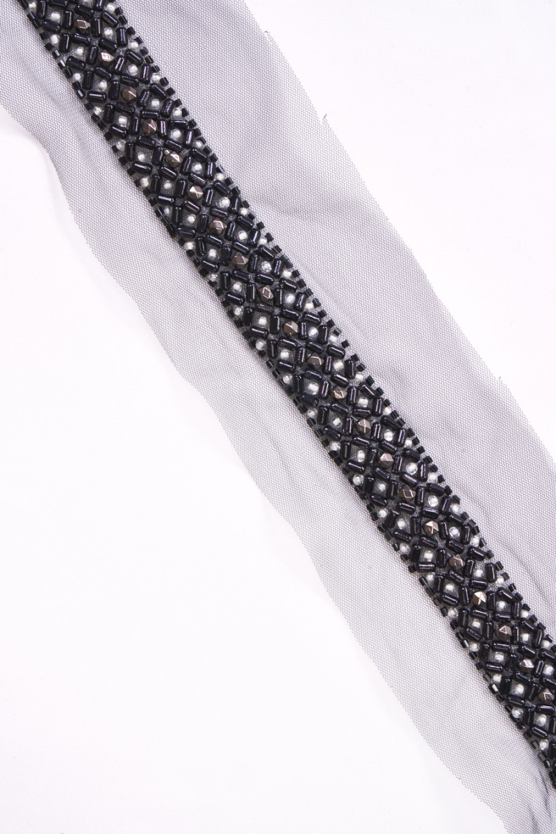Italská galanterní páska v černé barvě, šíře 2,5 cm, bohatě zdobená korálky. Páska je vyrobena ze tří druhů korálků: černé, tmavě grafitové a bílé. Celek je ušitý na černé tylové síťovině. Krásný návrh na ozdobení elegantních šatů, halenky nebo sukně.