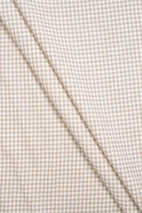 Italská bavlněná látka se lnem a polyesterem s motivem malé kuřecí nohy v béžové a krémové barvě. Tkanina je masitá, nepružná, s mírně volnou vazbou, ale zcela neprůhledná. Klasický návrh pro kalhoty, saka, šaty, sukně a šortky.