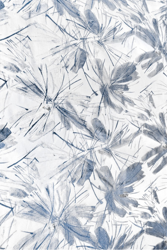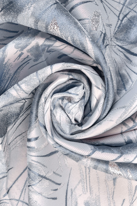 Italská žakárová kostýmová látka ve světle šedé barvě. Materiál má krásný velký vzor chlupatých květů v šedé barvě s kapkou fialové. Celé je to zdobeno lesklou stříbrnou nití, která mu dodává elegantní vzhled. Je to skvělý návrh na ušití šatů nebo kostýmu pro zvláštní příležitost, jako je svaté přijímání nebo svatba.