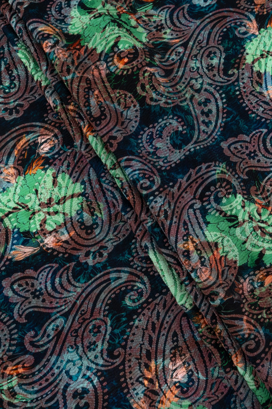 Italská žakárová vlněná tkanina - oboustranná. Na jedné straně s pastelovým motivem paisley na tmavě modrém a modrozeleném pozadí v listech a na druhé straně s krémovým vzorem paisley na béžovém a růžovém podkladu. Tkanina je silnější, tuhá, neelastická.