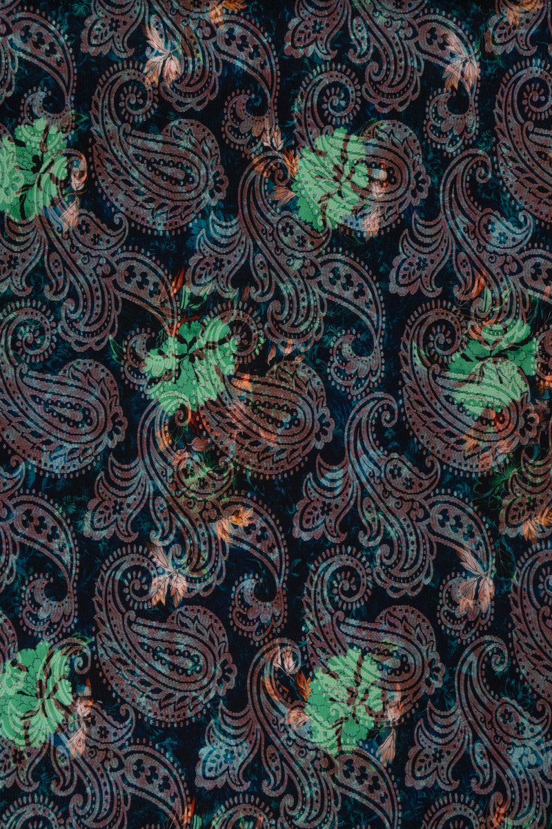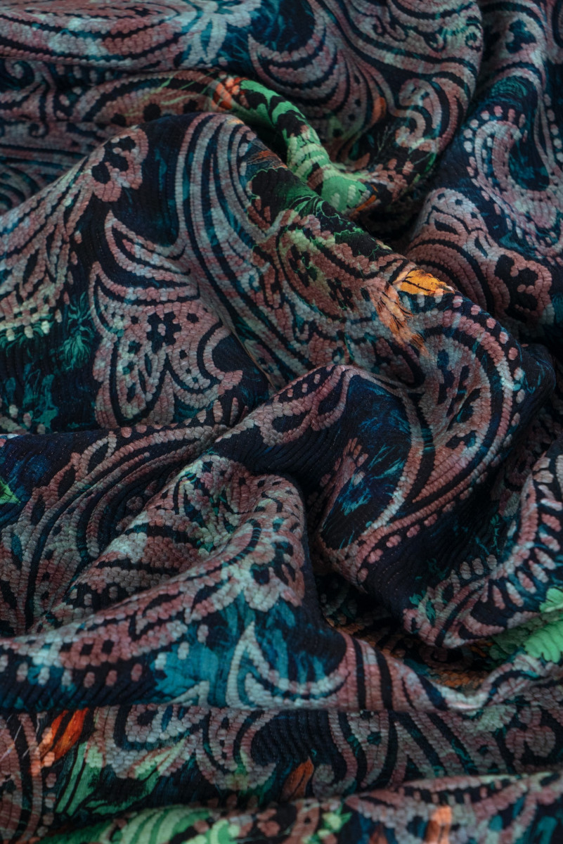 Italská žakárová vlněná tkanina - oboustranná. Na jedné straně s pastelovým motivem kašmírového vzoru na tmavě modrém a modrozeleném pozadí v listech a na druhé straně s krémovým vzorem kašmírového vzoru na béžovém a růžovém pozadí. Silnější, tuhá, neelastická tkanina - ideální pro šití kabátu, bundy, bundy nebo pro dekorativní účely.