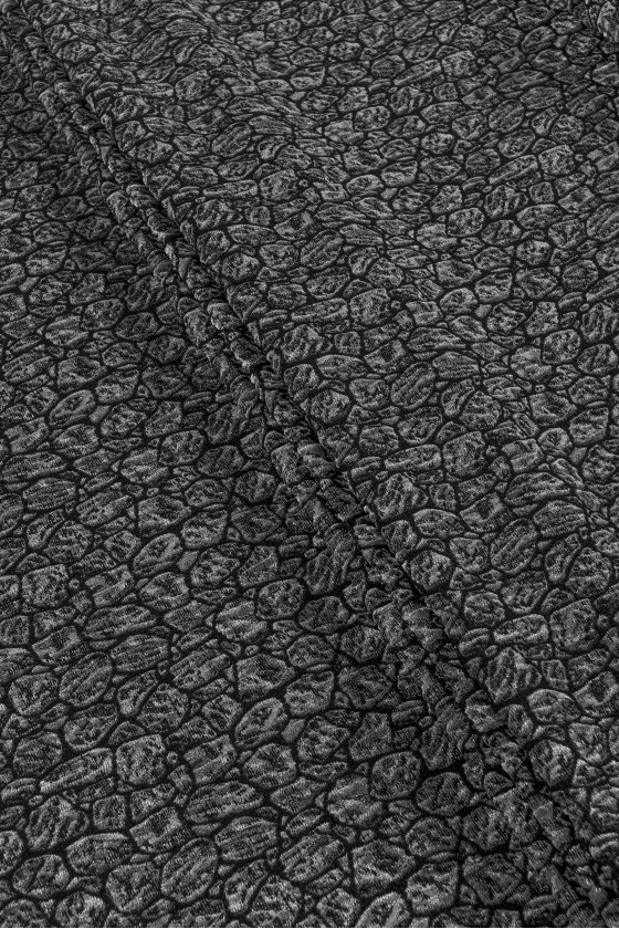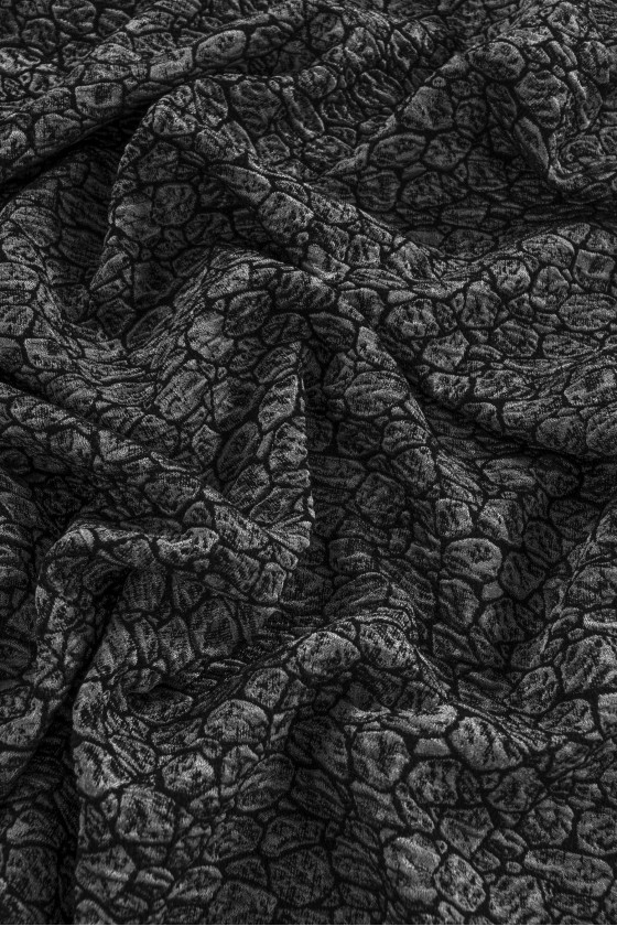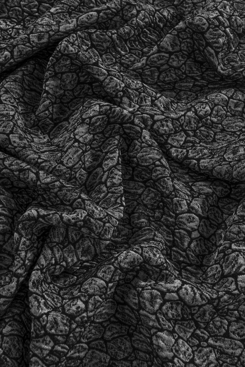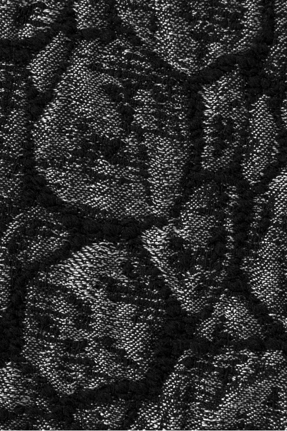 Italská žakárová kostýmová látka s černými a šedými, geometrickými vzory. Látka, silnější, dvojitá na levé straně v černé barvě.