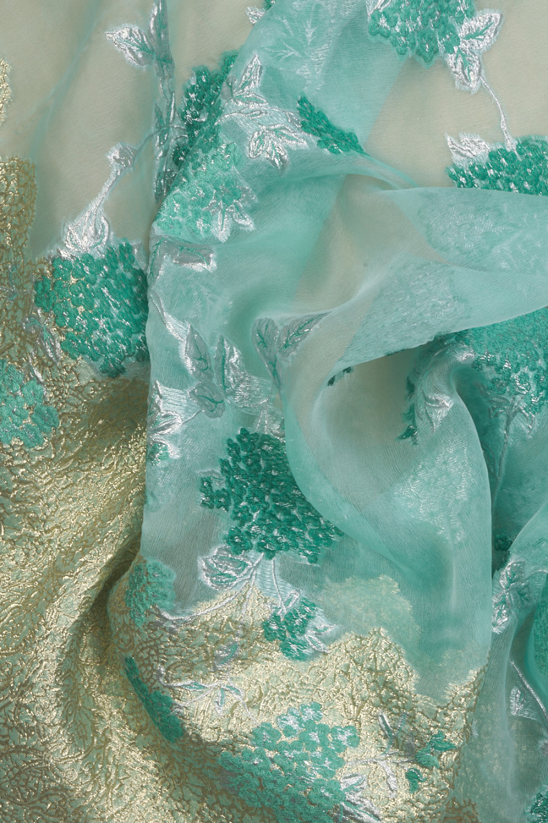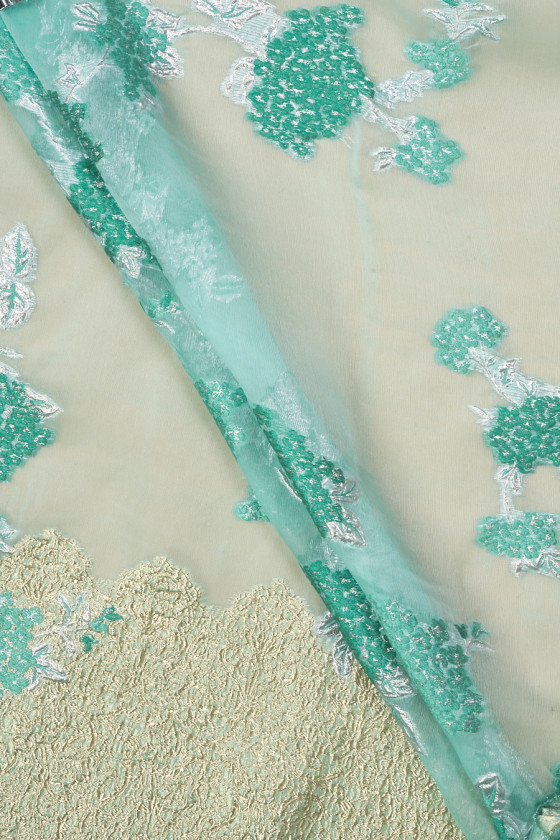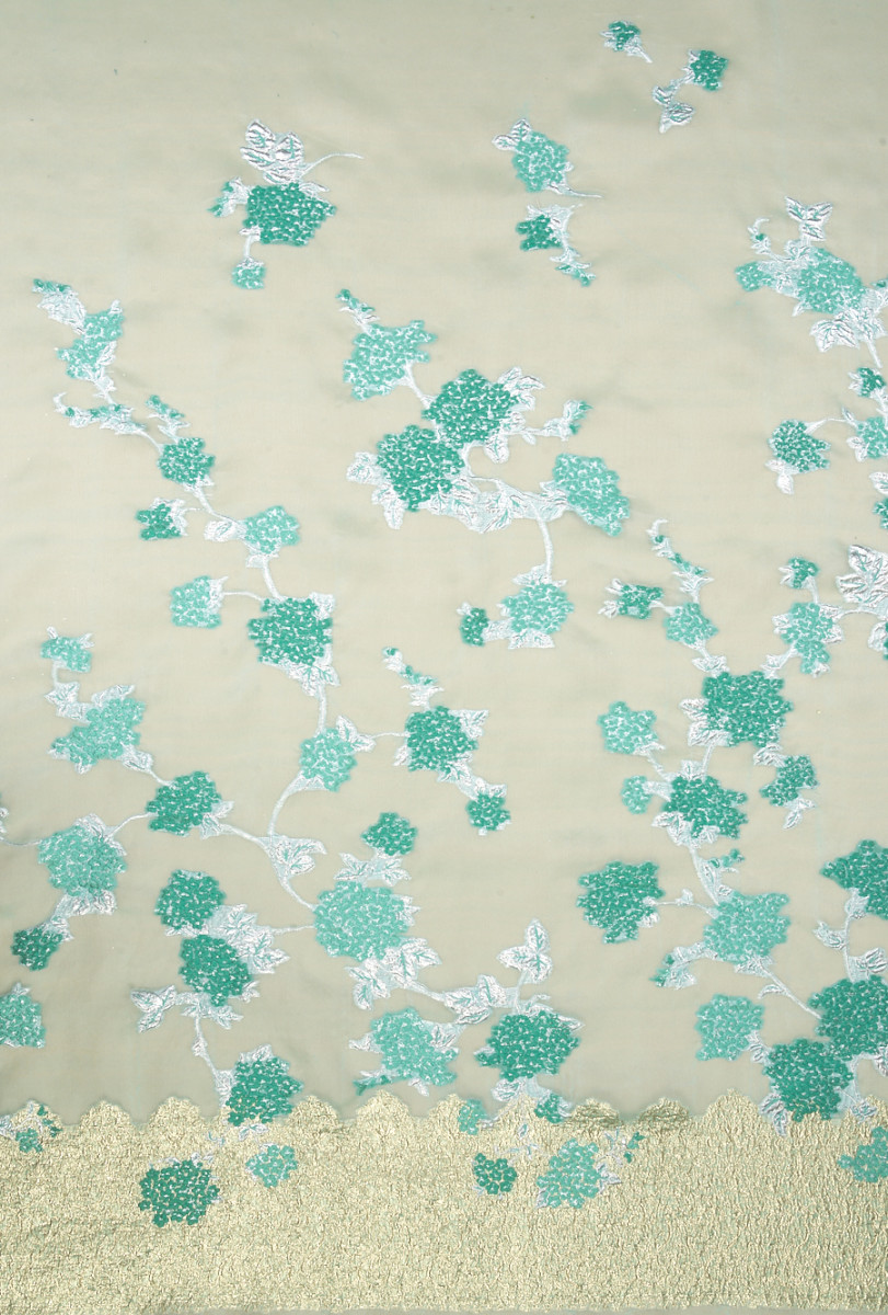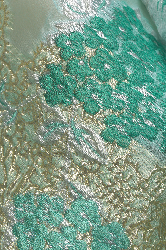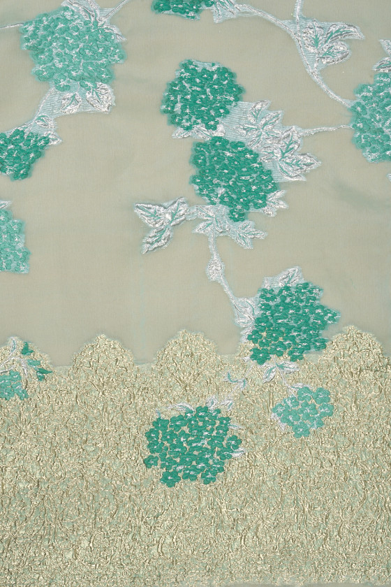 Italská organzová látka v kupónu o rozměrech 190 cm* 140 cm, zdobená lurexovou nití. Tyrkysová látka s žakárovým motivem květů buz v tyrkysové barvě se stříbrnými ratolestmi, vzor směrem ke spodní části kupónu zesiluje, který je zakončen 25 cm širokým zlatým páskem.