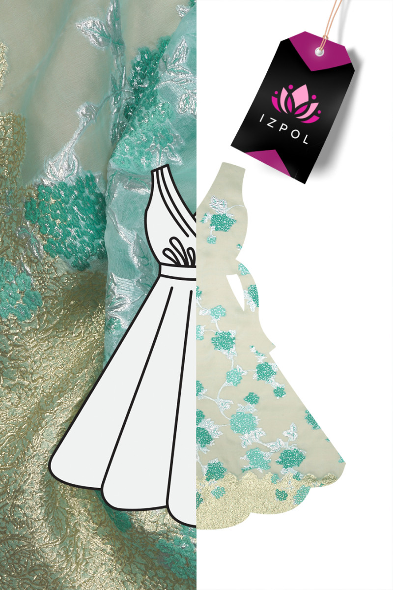Italská organzová tkanina ve vzoru o rozměrech 190 cm* 140 cm, zdobená lurexovou nití. Tyrkysová látka s žakárovým motivem květů buz v tyrkysové barvě se stříbrnými větvemi, vzor se zahušťuje směrem ke spodní části kupónu, který je zakončen 25 cm širokým zlatým páskem. Látka je tenká, průhledná, neelastická, mírně tuhá. Ideální pro šití šatů nebo sukně.