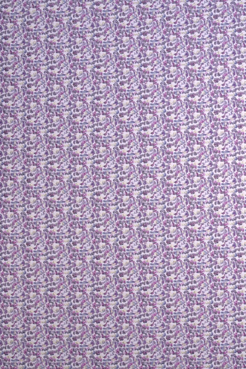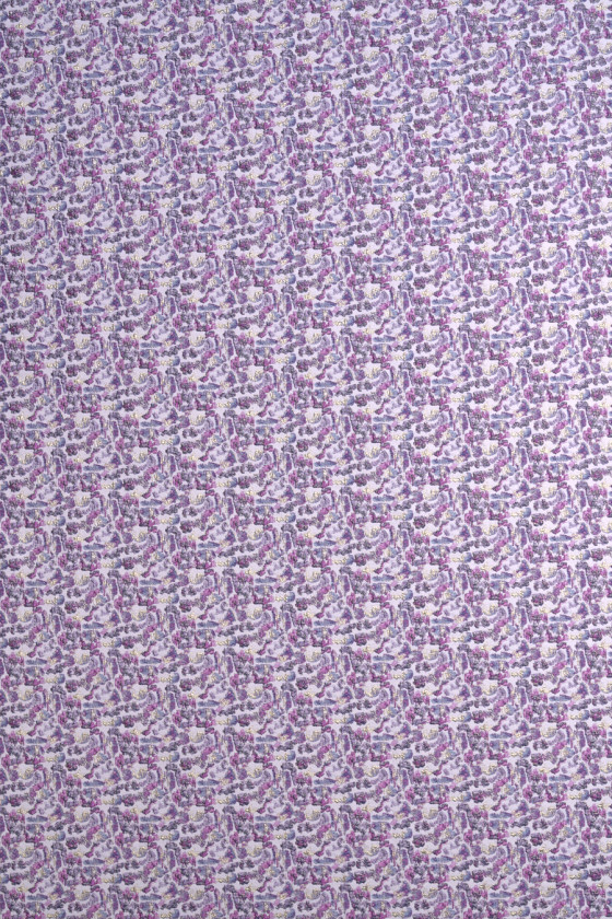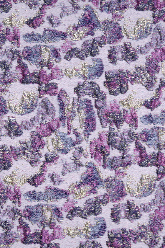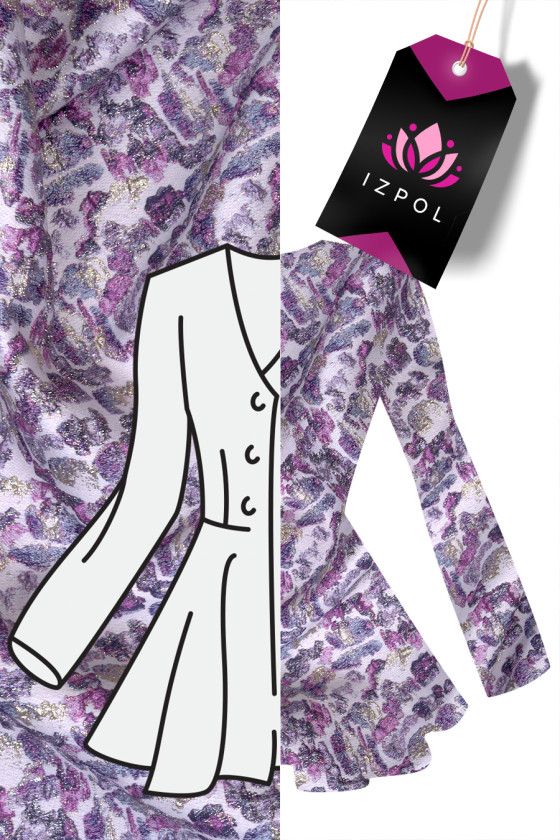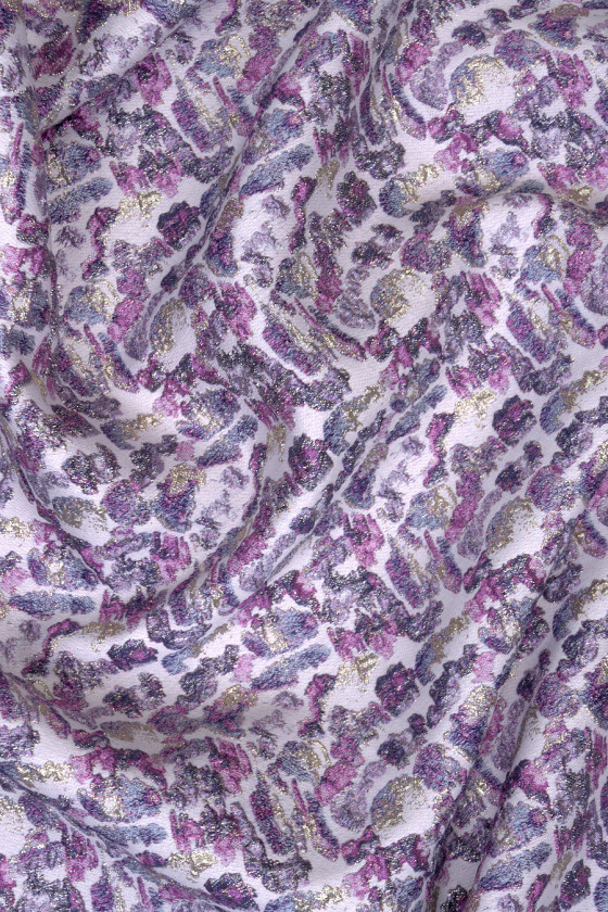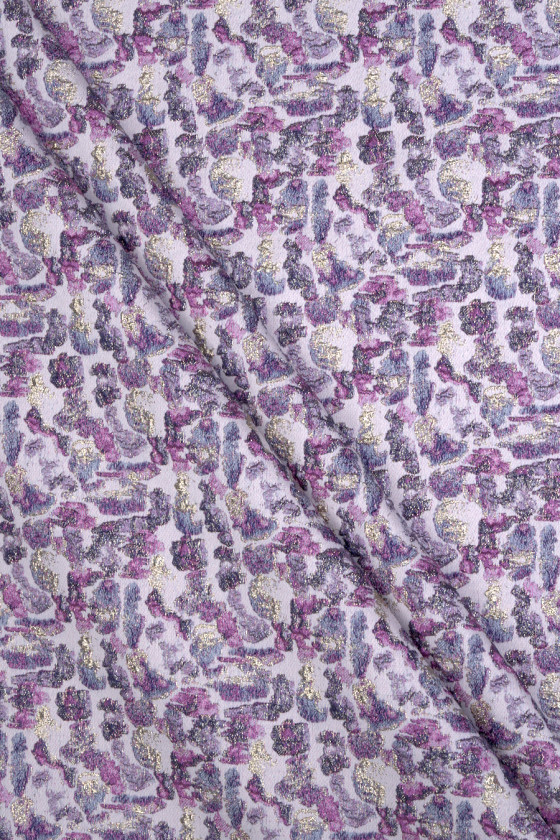 Italská žakárová kostýmová látka s hustým, efektním vzorem ve fuchsiové, fialové a zlaté barvě. Vyvýšený vzor je vyroben na světle růžovém pozadí, které dodává látce světlý vzhled. Látka je tenká, mírně tuhá - doporučujeme použít podšívku.