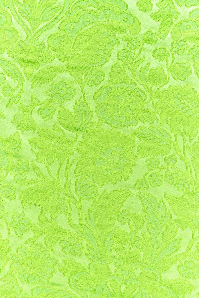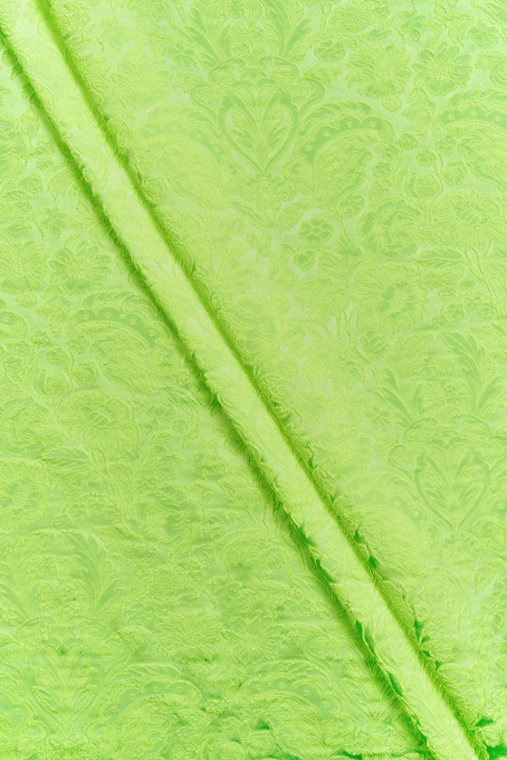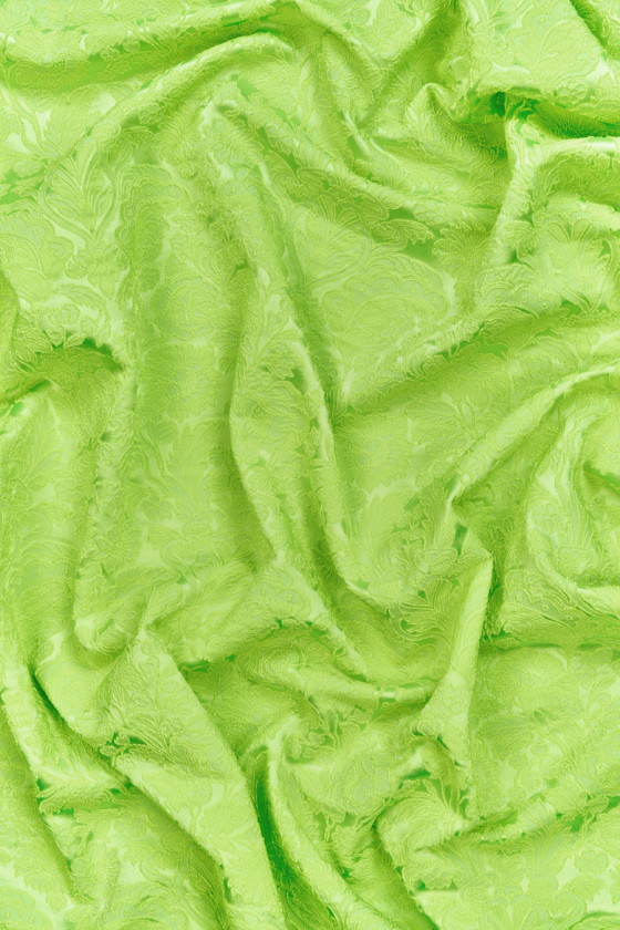 Elastický žakár v neonově limetkové barvě. Látka je tkaná v konvexním paisley vzoru se saténově matným povrchem, který jí dodává eleganci.