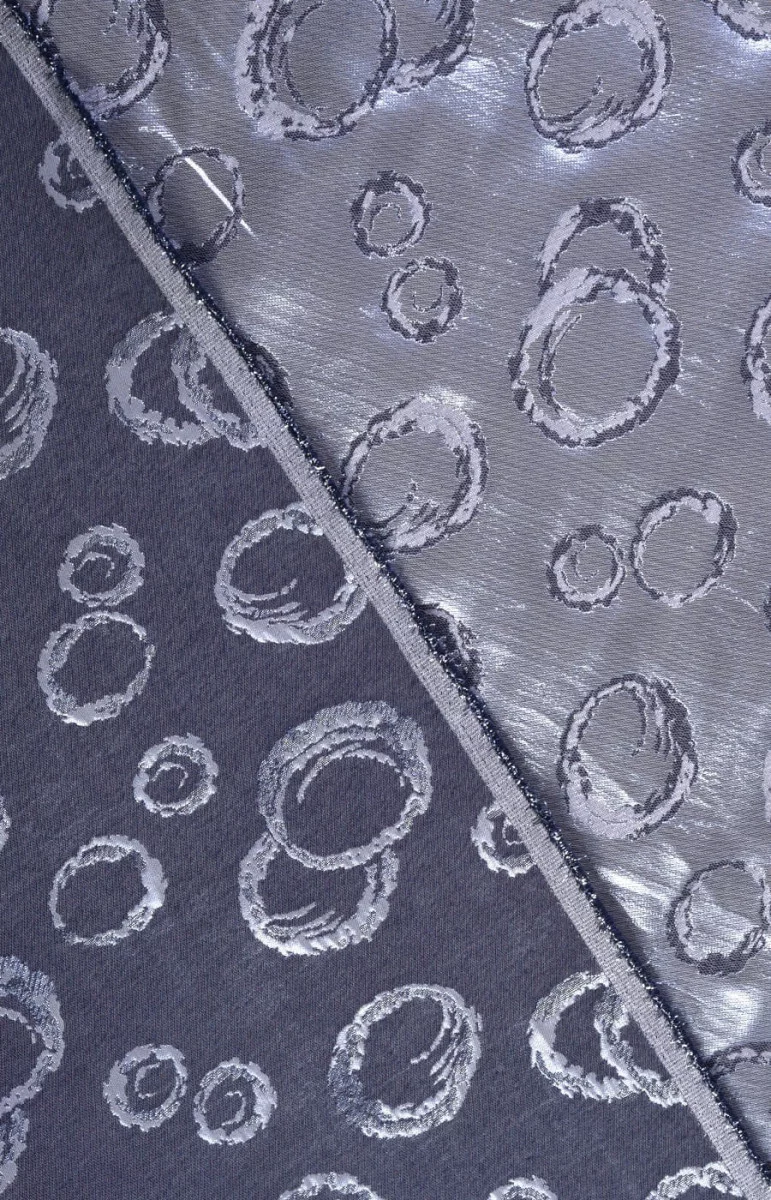 Zajímavý žakárový návrh. Látka Je tenký, neelastický. Barva je stříbřitá holubice (ocelově modrá). Látku lze použít oboustranně. Ideální pro saka, šaty, sukně nebo tenké jarní kabáty.